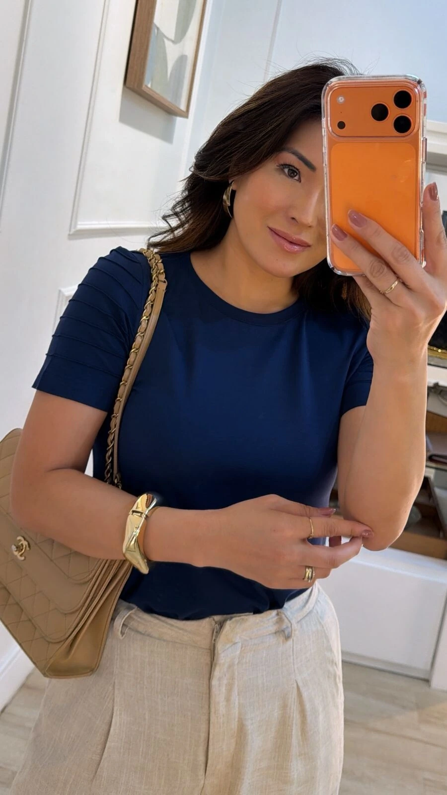 Blusa confeccionada em malha. Possui gola careca, mangas curtas, com nervuras em relevos, e pespontos.