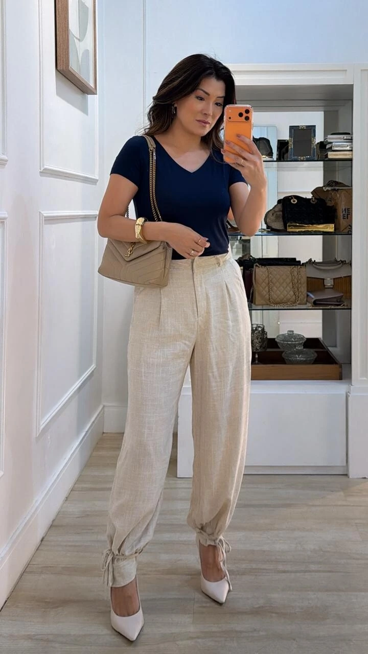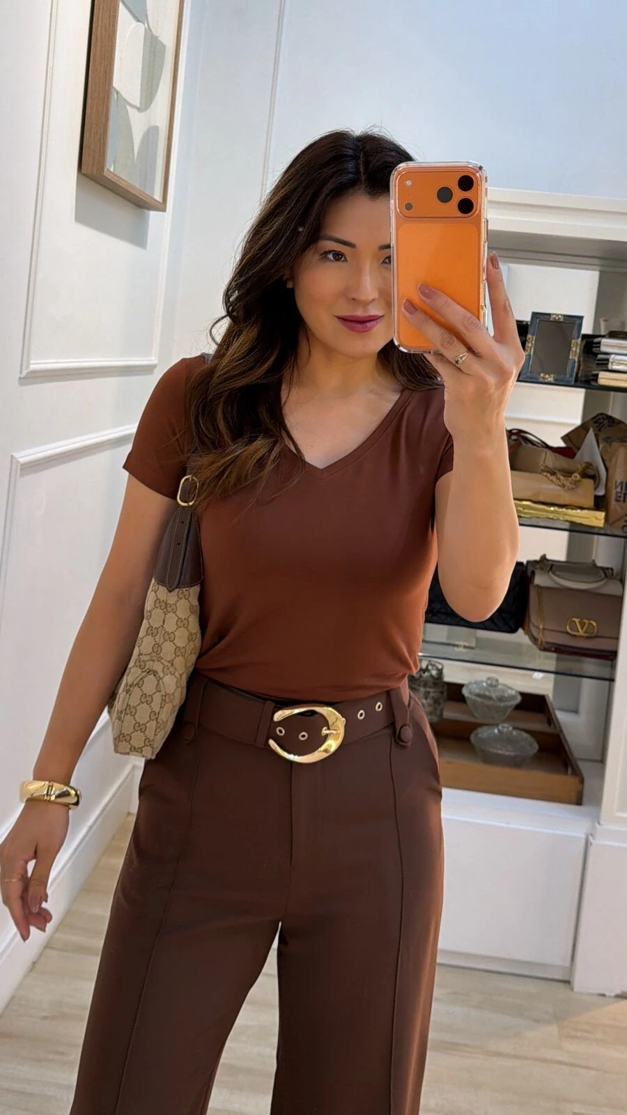 Blusa confeccionada em malha. Possui decote V, mangas curtas, pespontos.