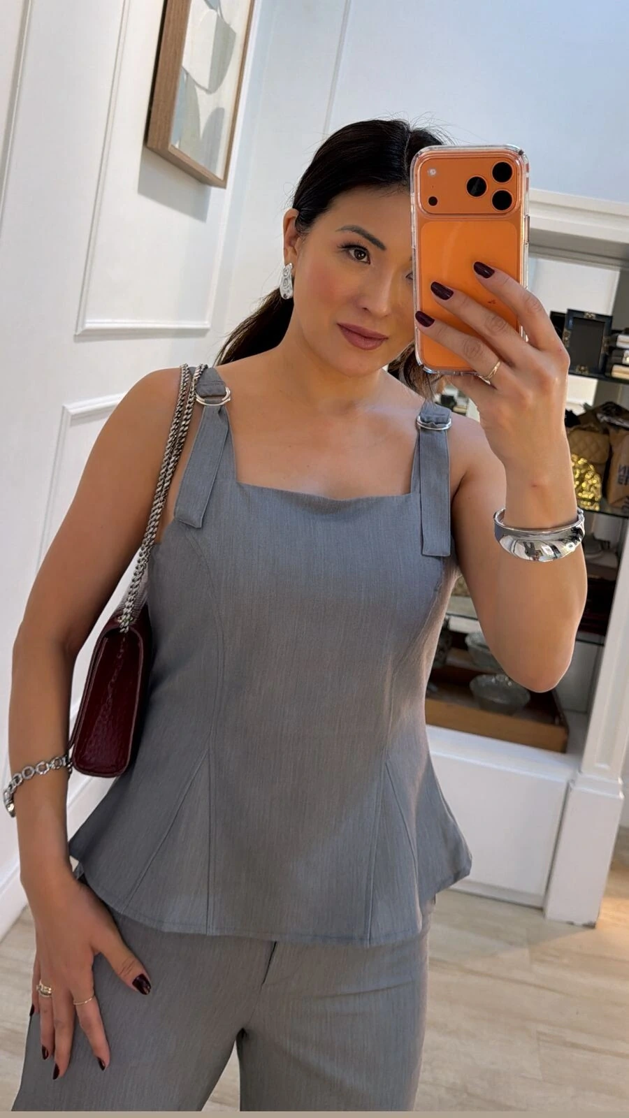Blusa confeccionda em alfaiataria . Possui recorte na parte frontal, zíper invisível na lateral, alças com fivela dupla.
