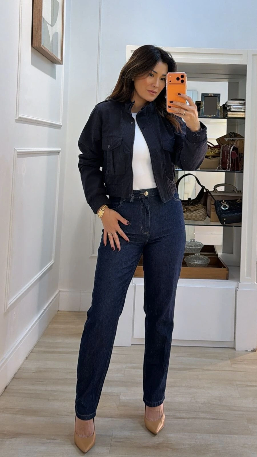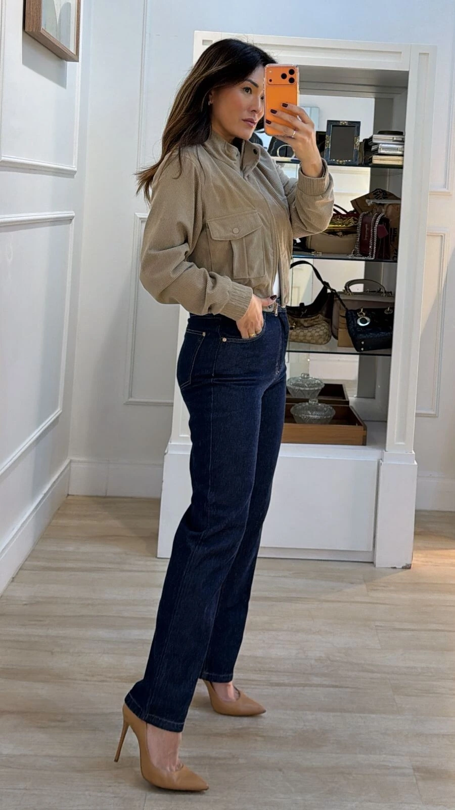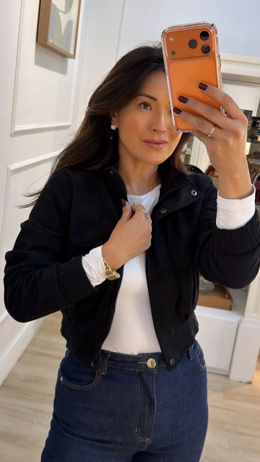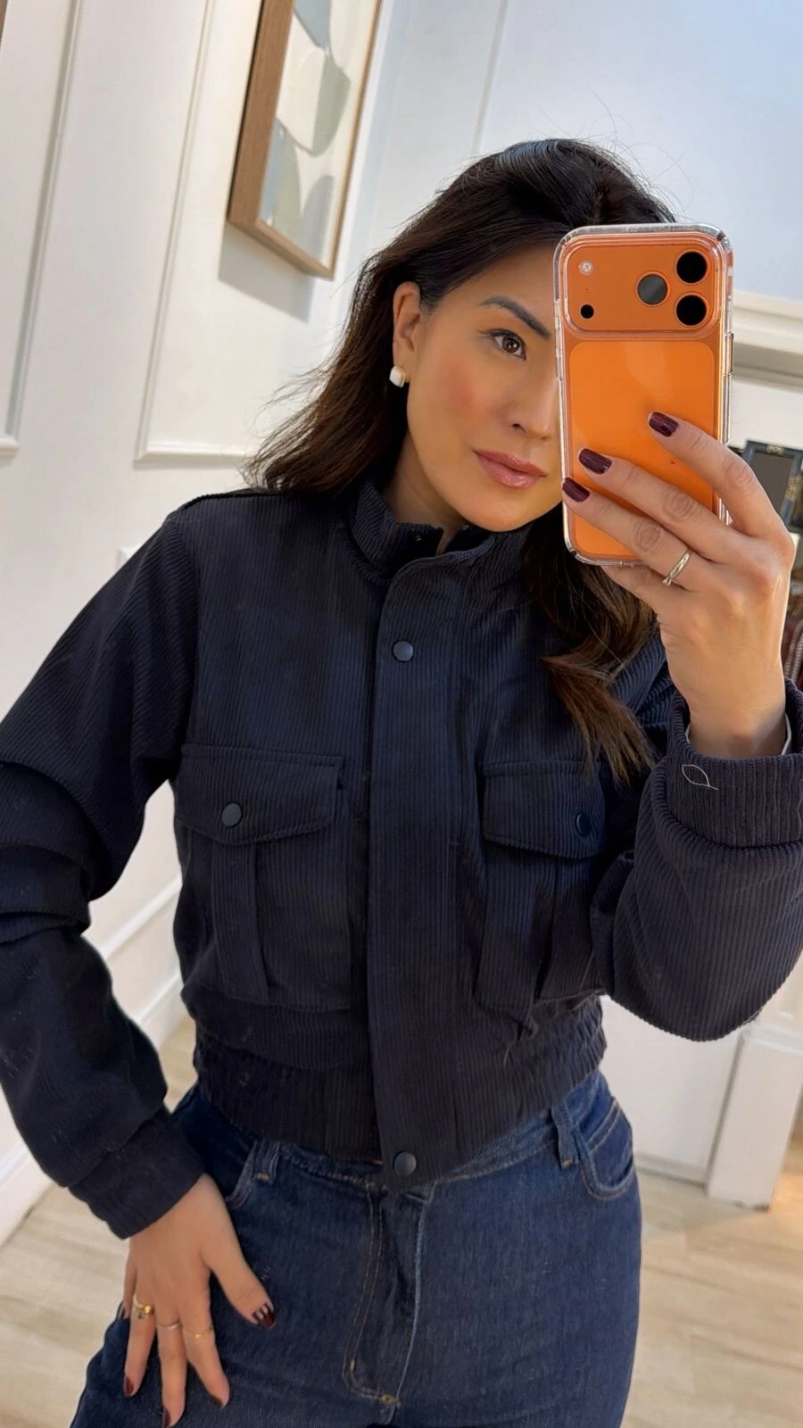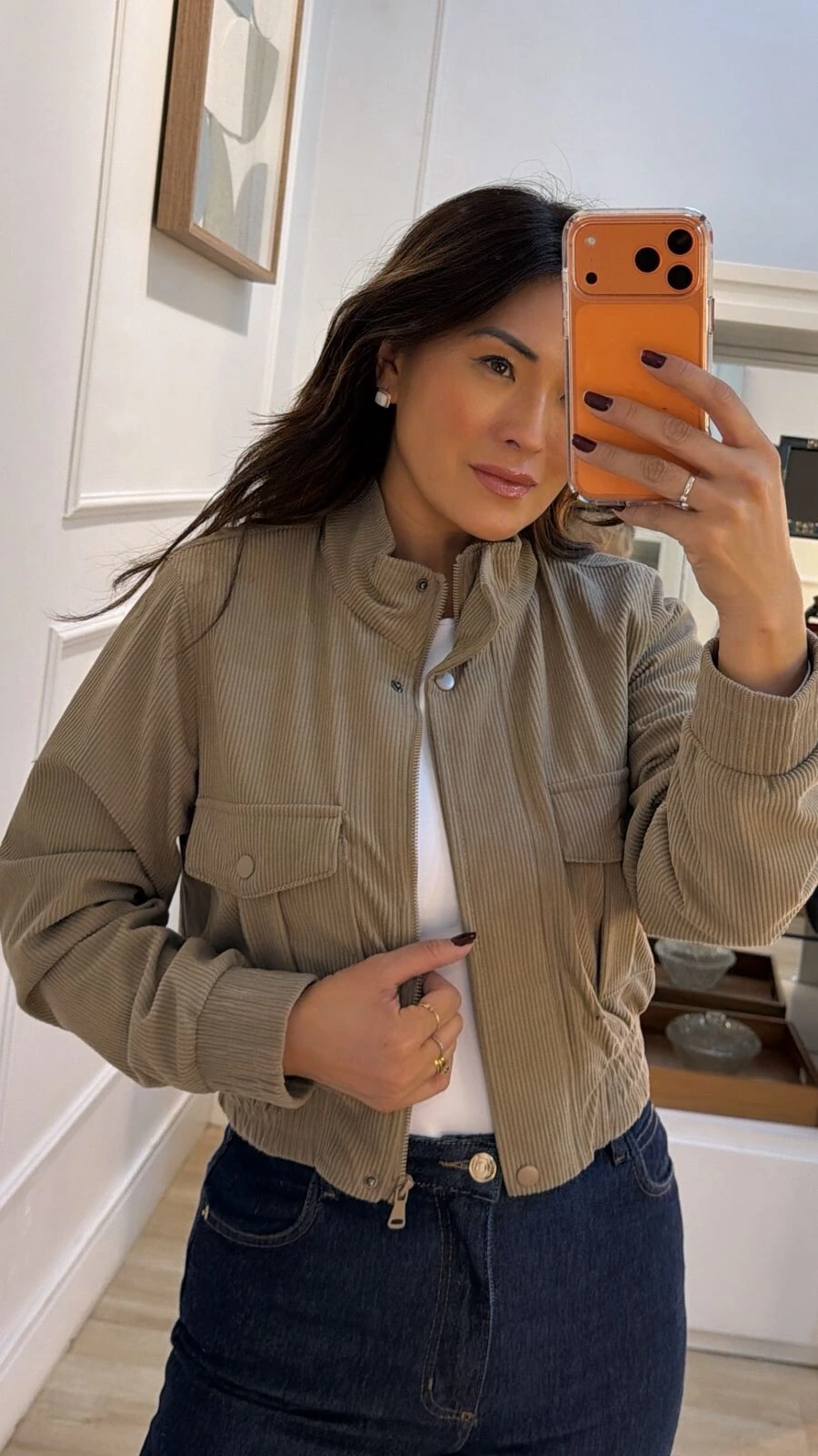 Jaqueta bomber em veludo cotelê. Possui forro, gola alta, mangas longas, elástico nos punhos e barrado, bolsos quadrados frontais, fechamento da peça por zíper e botões de pressão.