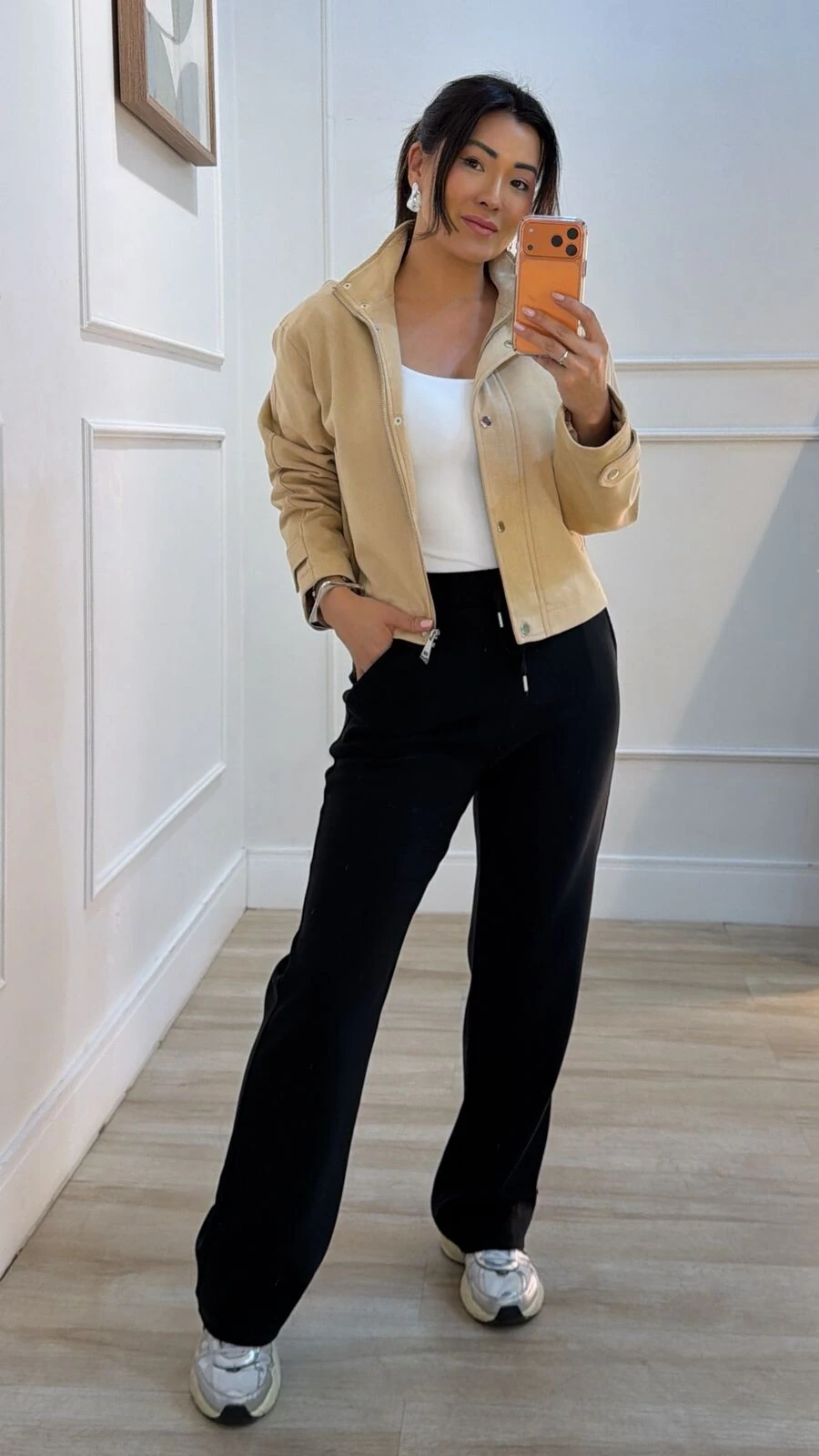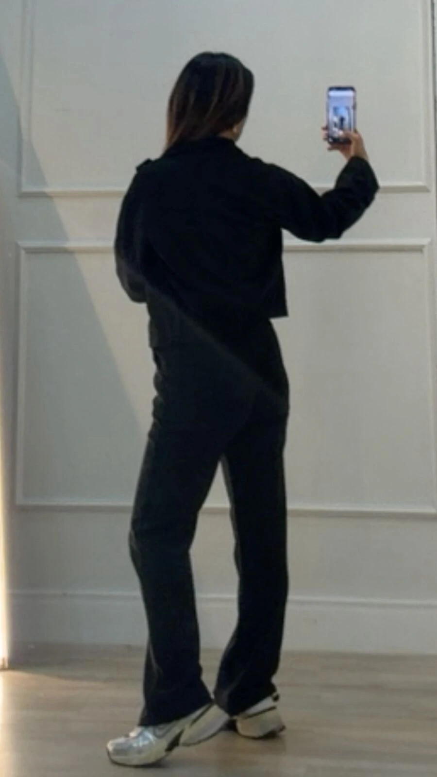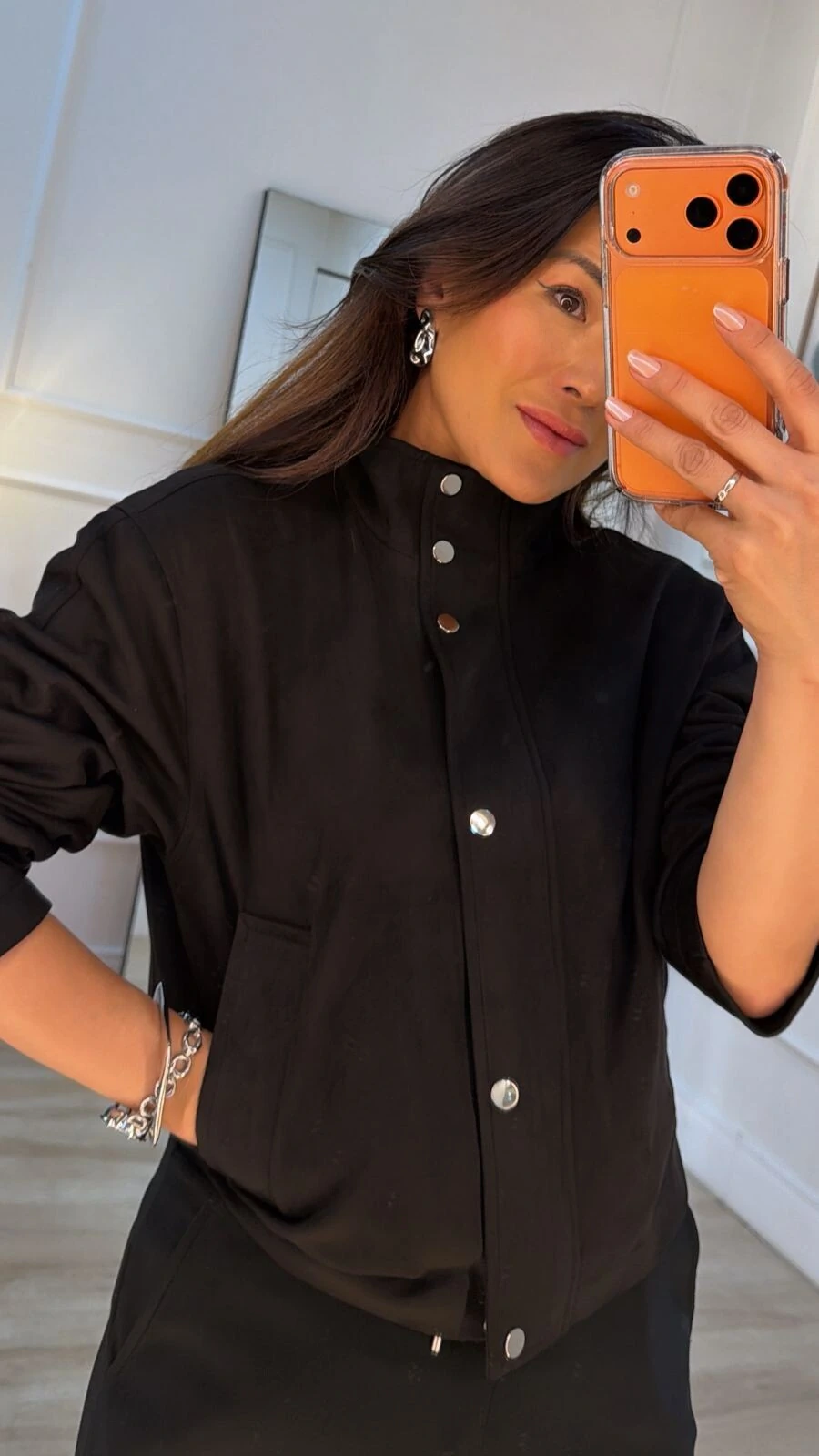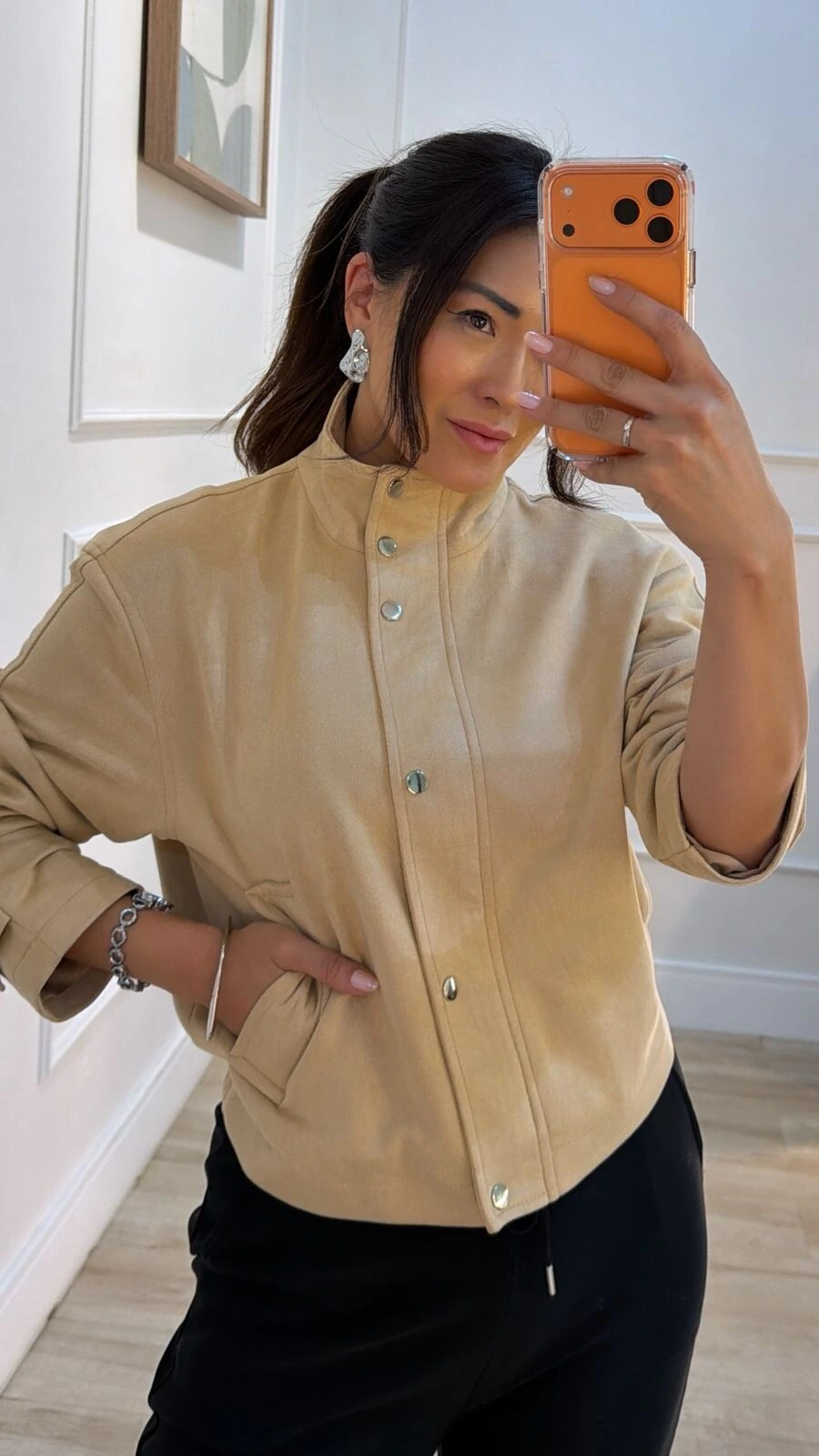 Jaqueta curta em suede. Possui forro, gola alta, bolsos com lapela, punhos com martingale, elástico no posterior do barrado, fechamento da peça por zíper e botões de pressão prata.