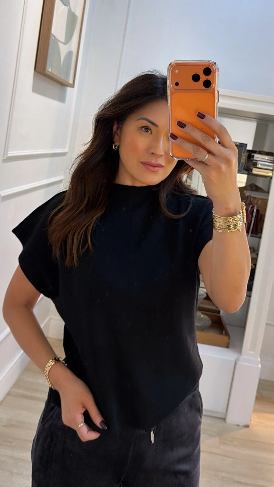 Blusa ampla confeccionada em tricot. Possui gola média, mangas curtas, nervura nos ombros.