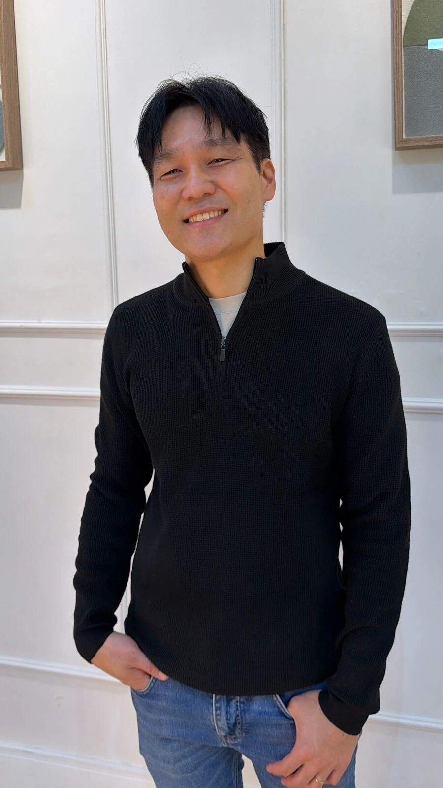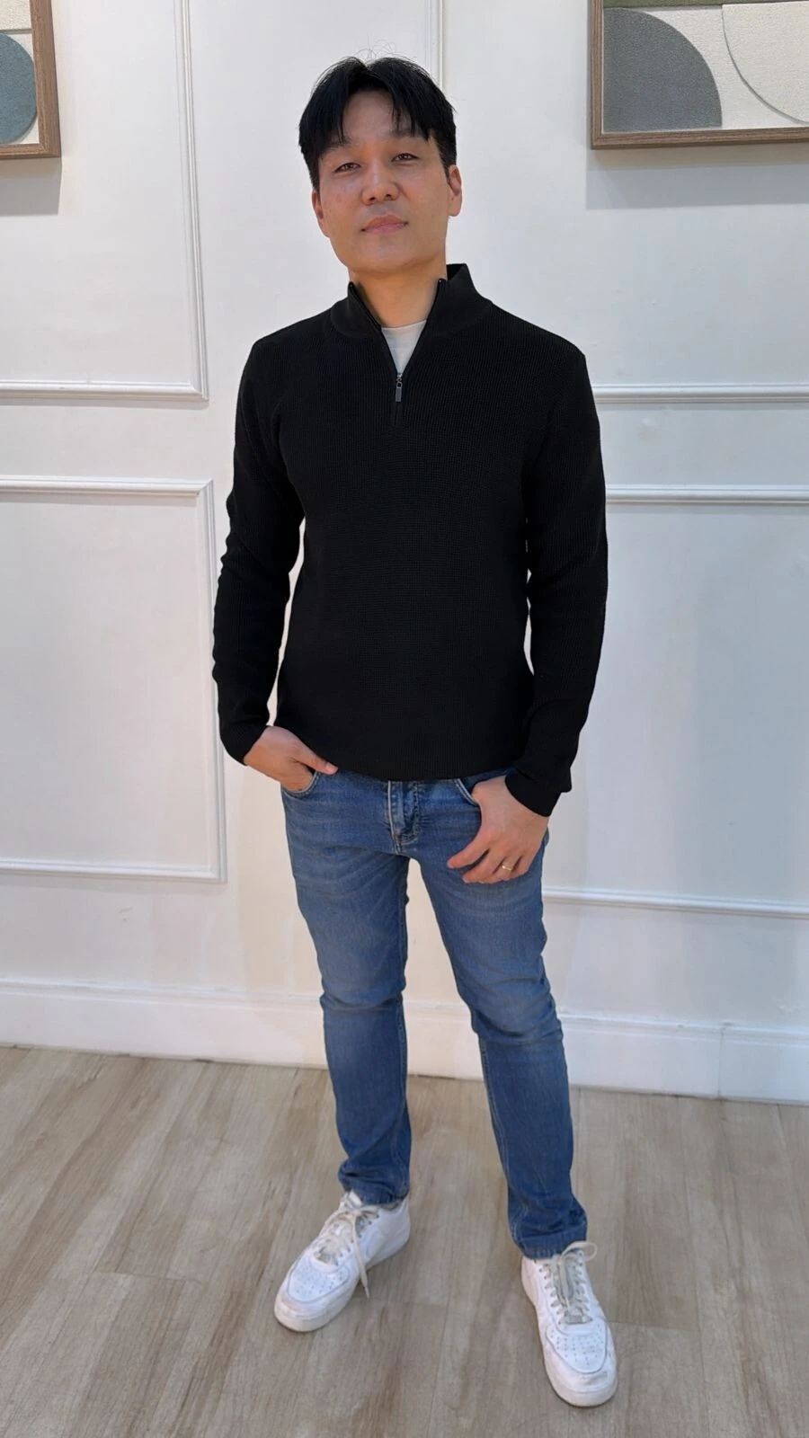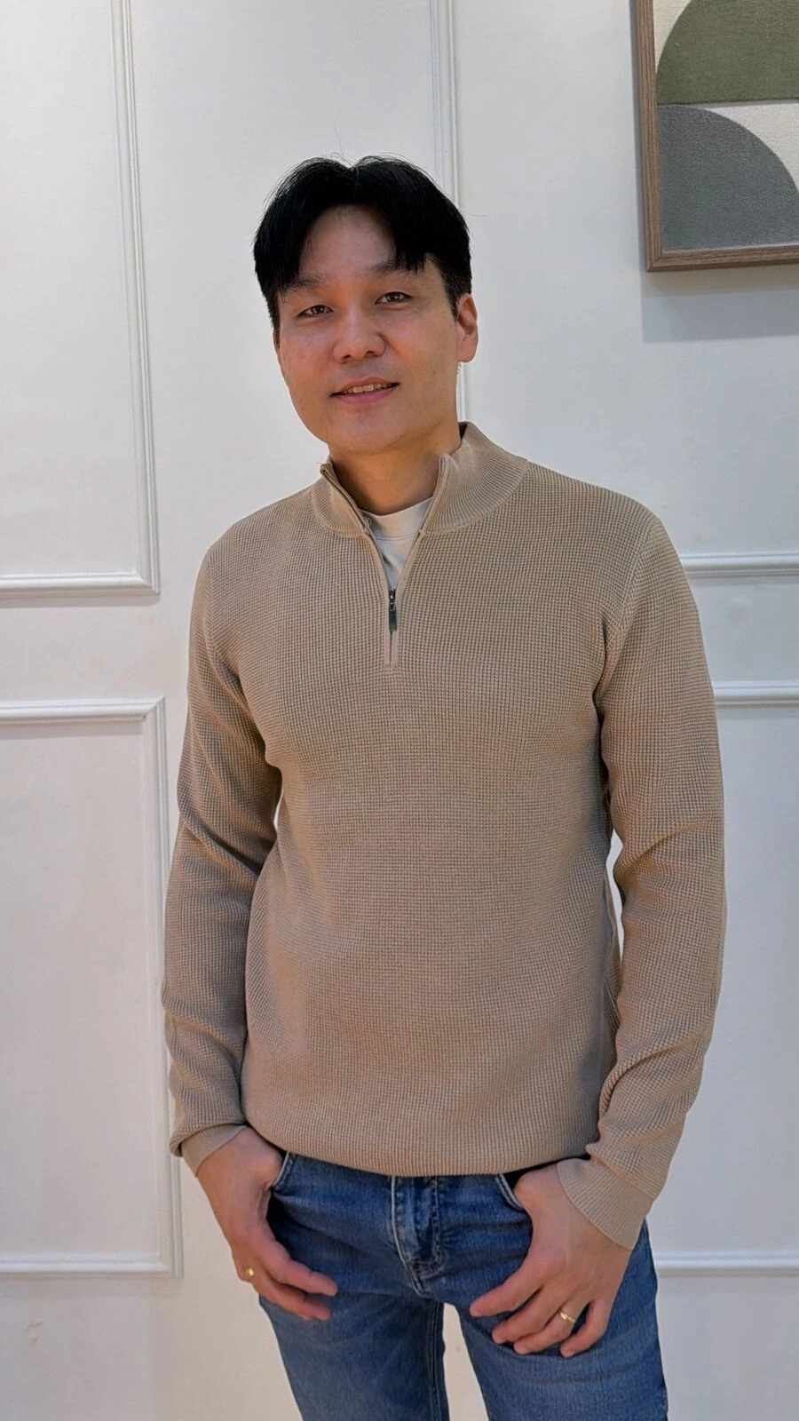 Blusa cacharrel confeccionada em tricot. Possui mangas longas, zíper frontal funcional, canelado na gola, punhos e barrado. Modelagem ampla.