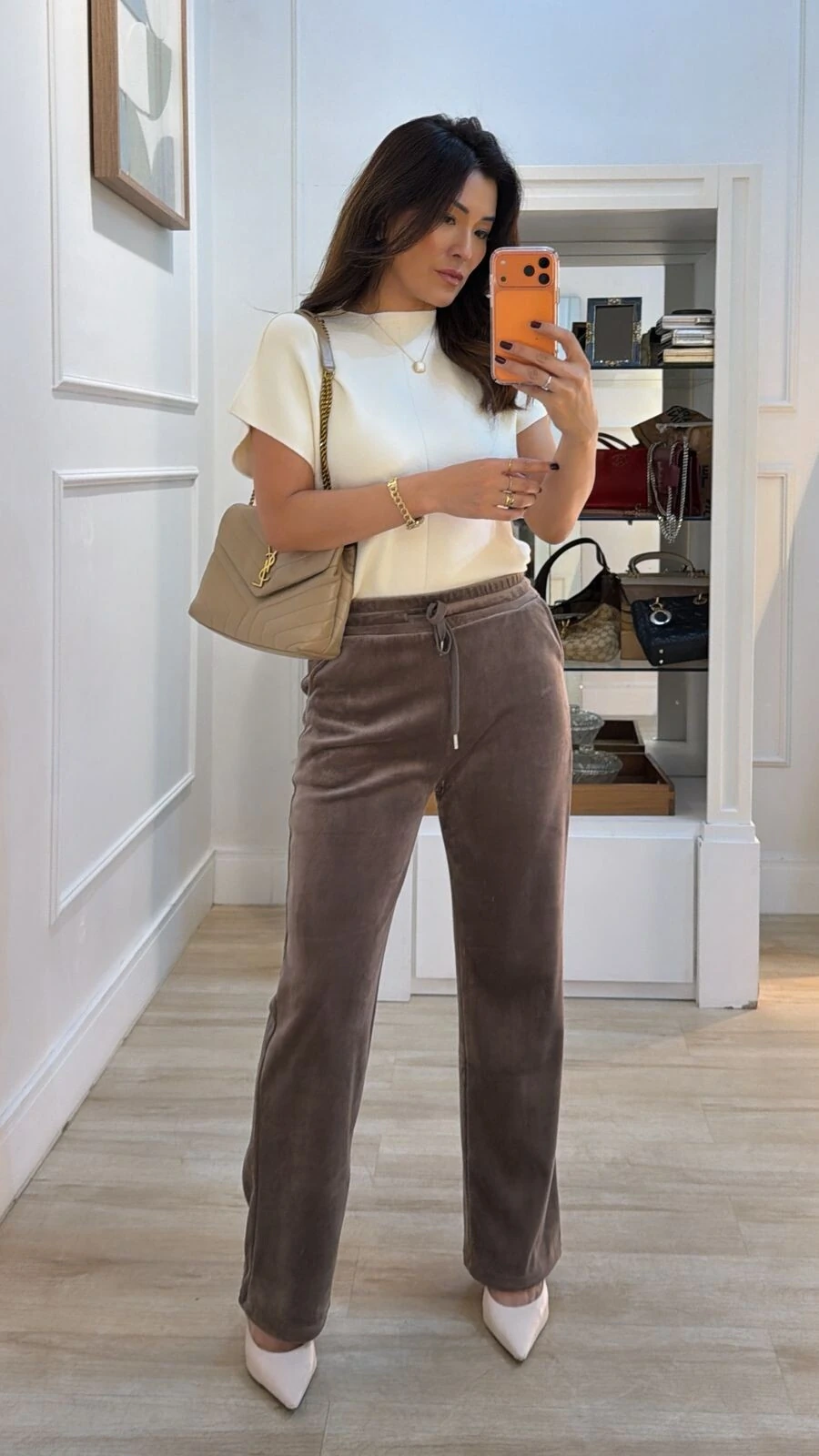 Calça pantalona em plush canelada. Possui pala com elástico e amarração regulável, e bolsos faca frontais.