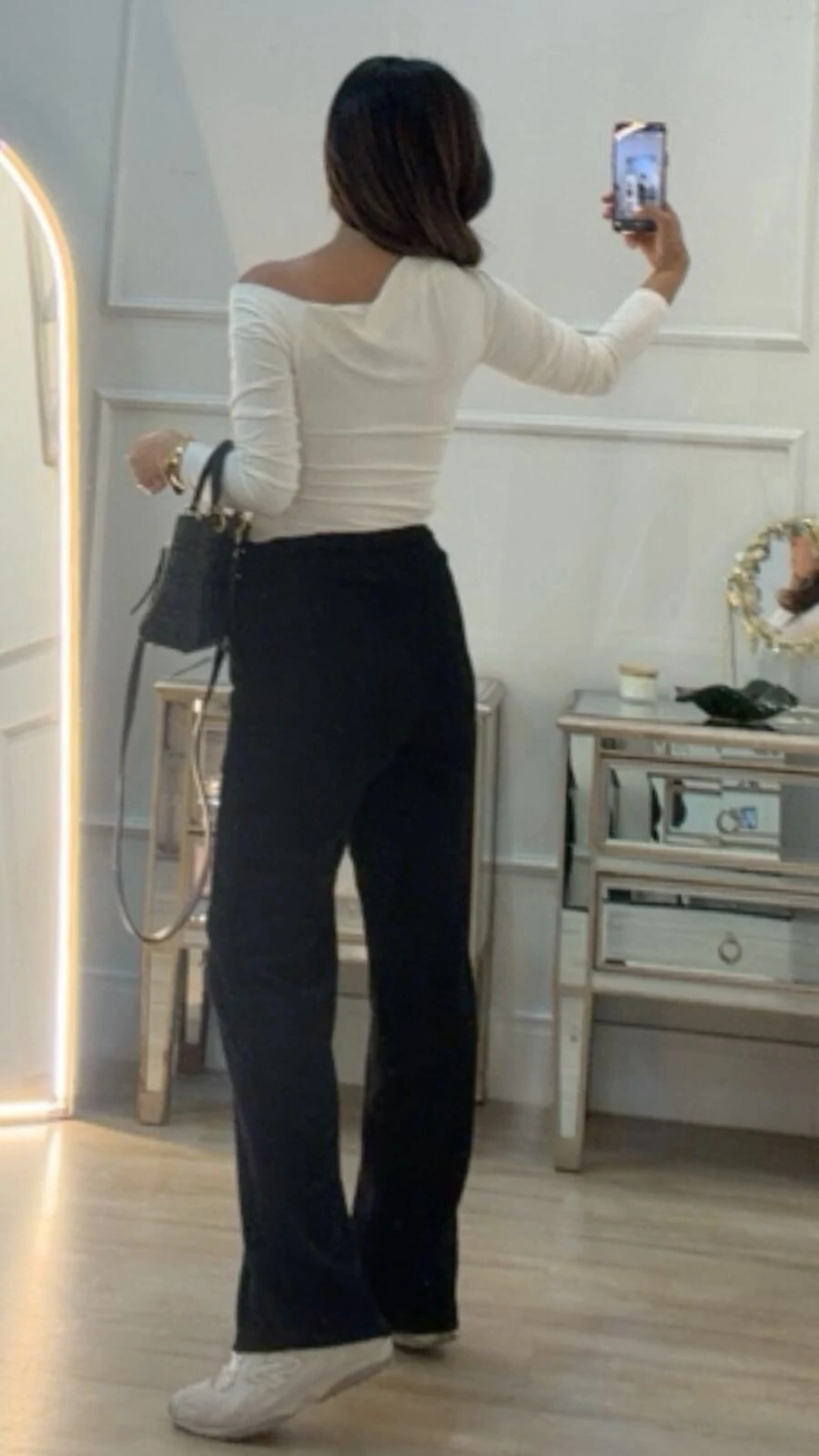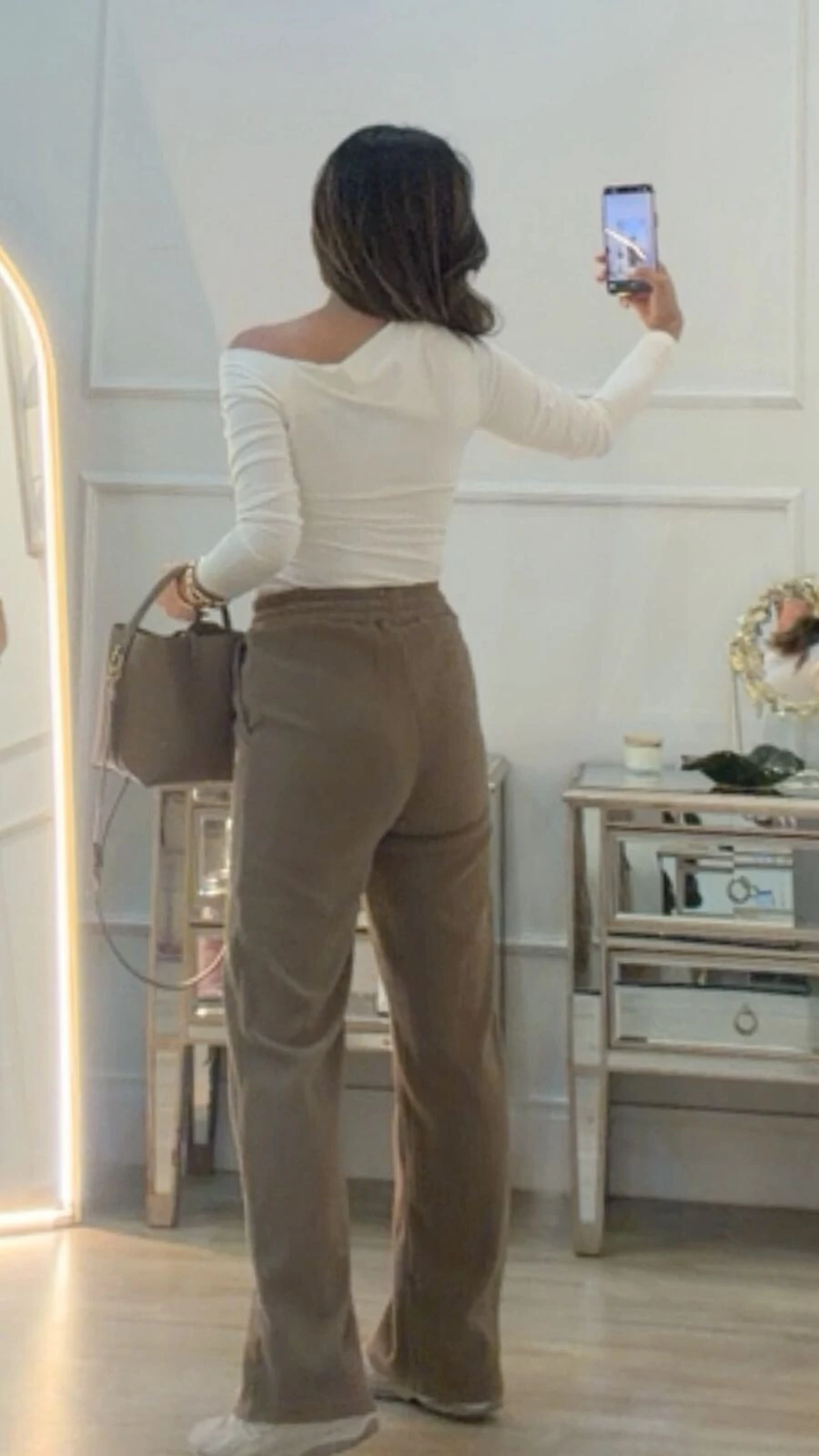 Calça pantalona canelada e com mini texturas. Possui pala com elástico e amarração regulável em cordão, e bolsos faca frontais.