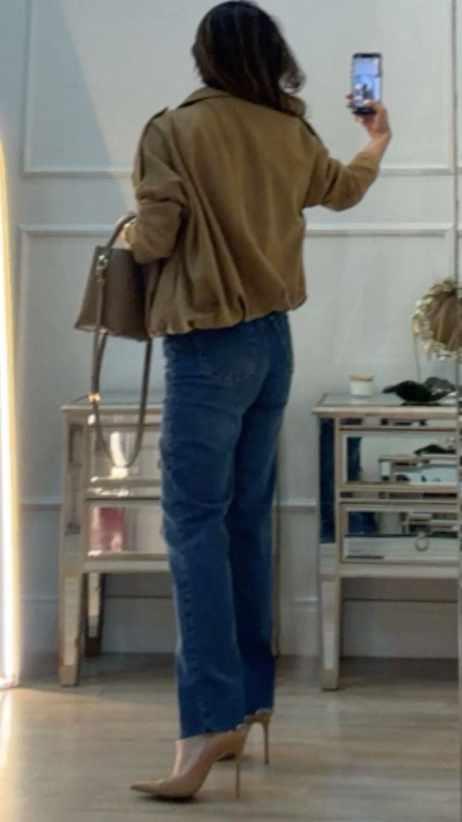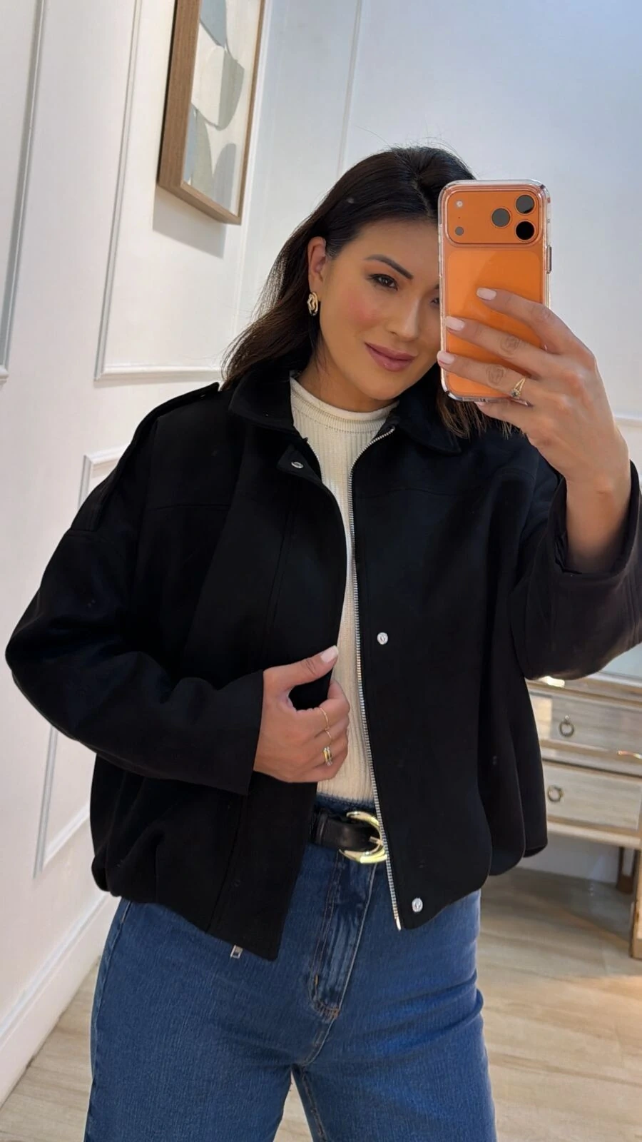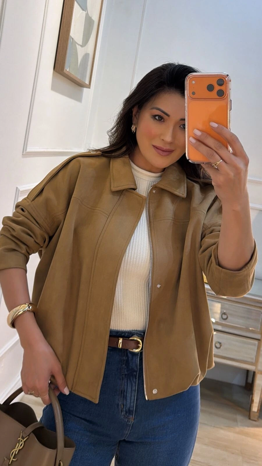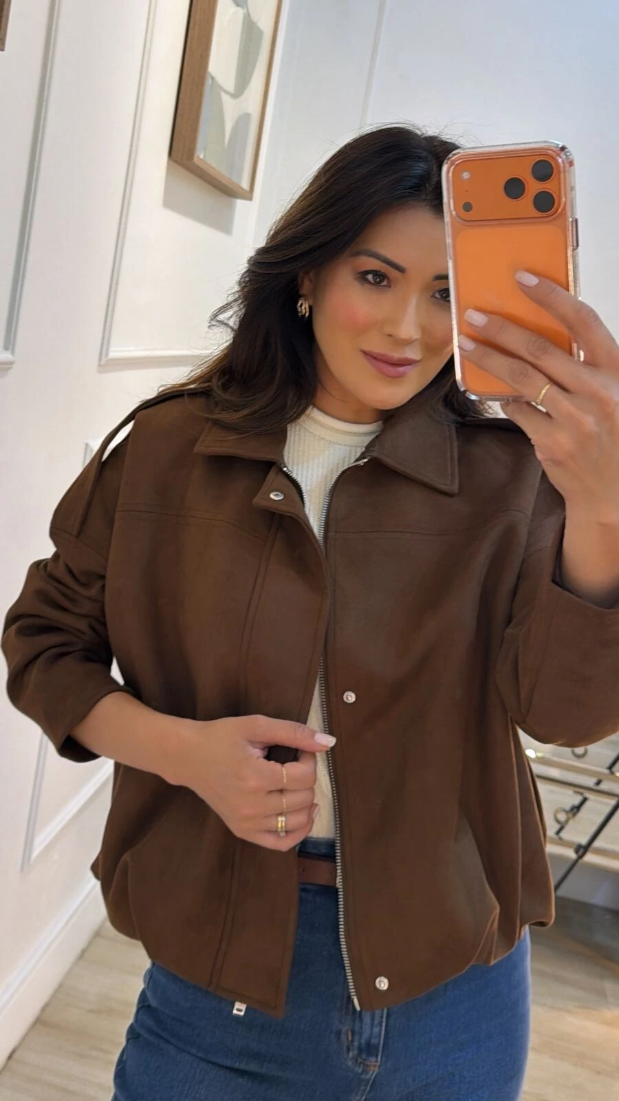 Jaqueta casaco balonê confeccionado em suede. Possui gola, mangas longas, martingalê nos ombros, recorte, pesponto, barrado em balonê, fechamento frontal da peça por zíper e boptão de pressão, e forro.