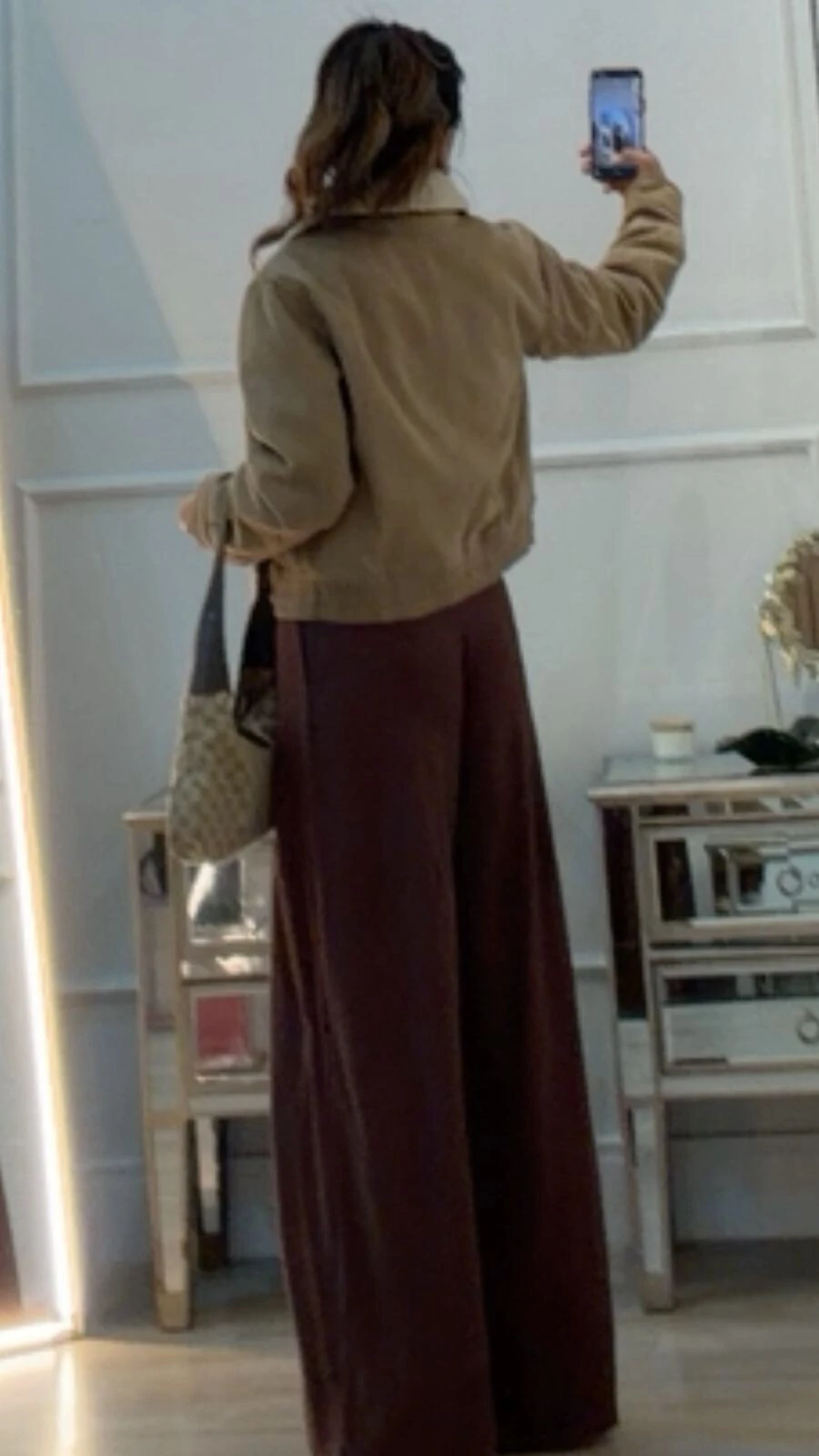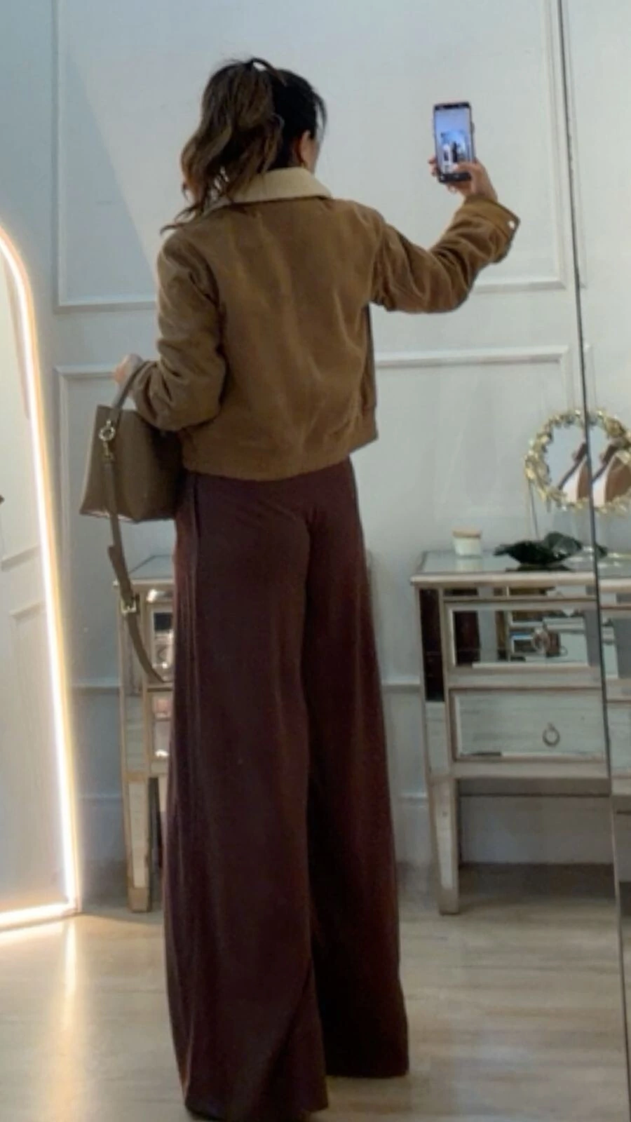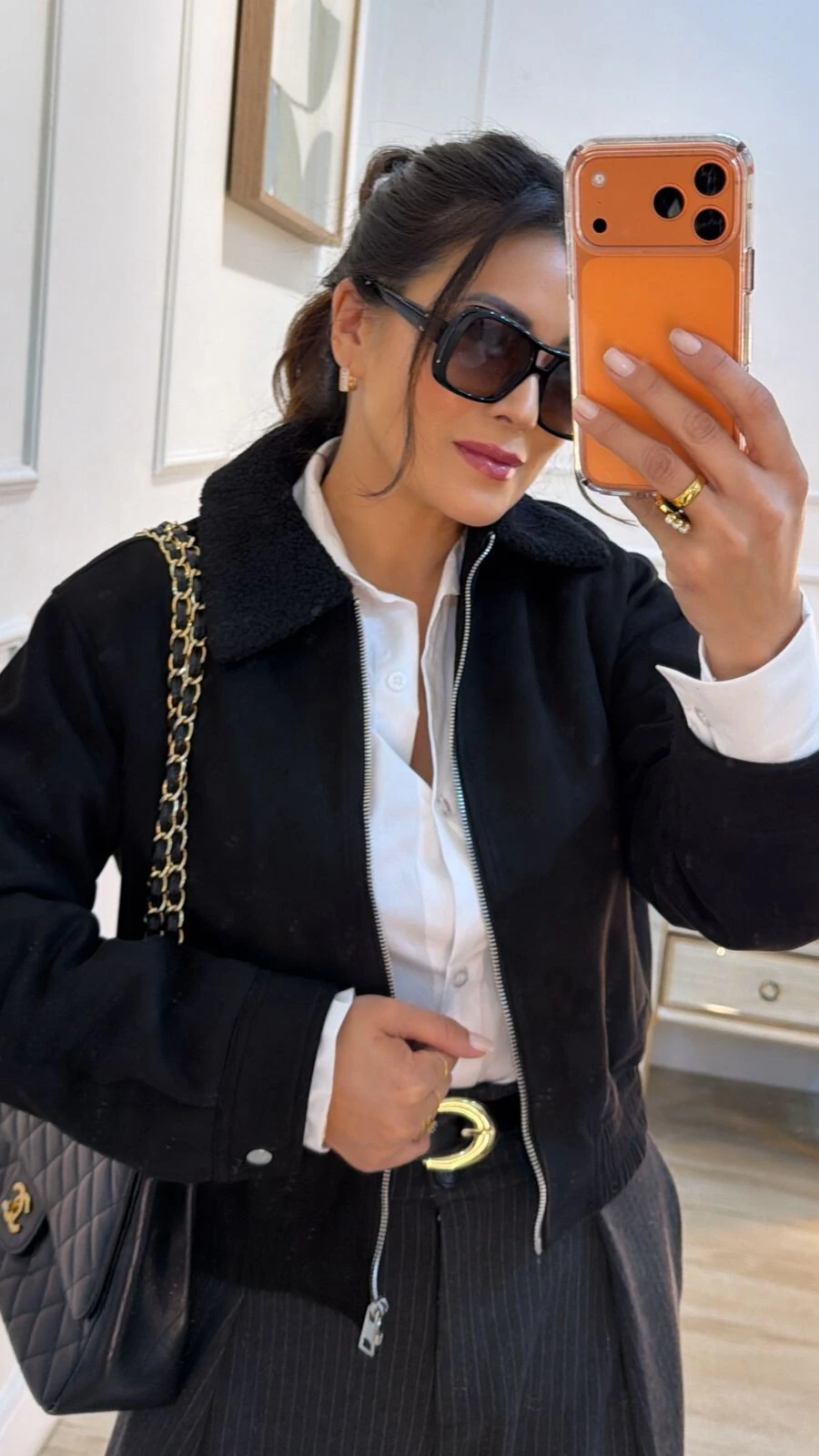 Jaqueta casaco confeccionada em suede com gola de ovelhinha. Possui gola, mangas longas, pregas nos punhos, barrado com elástico, bolsos frontais, fechamento dos punhos por botão de pressão, forro de ovelhinha, pesponto, e fechamento pela parte frontal da peça por zíper.
