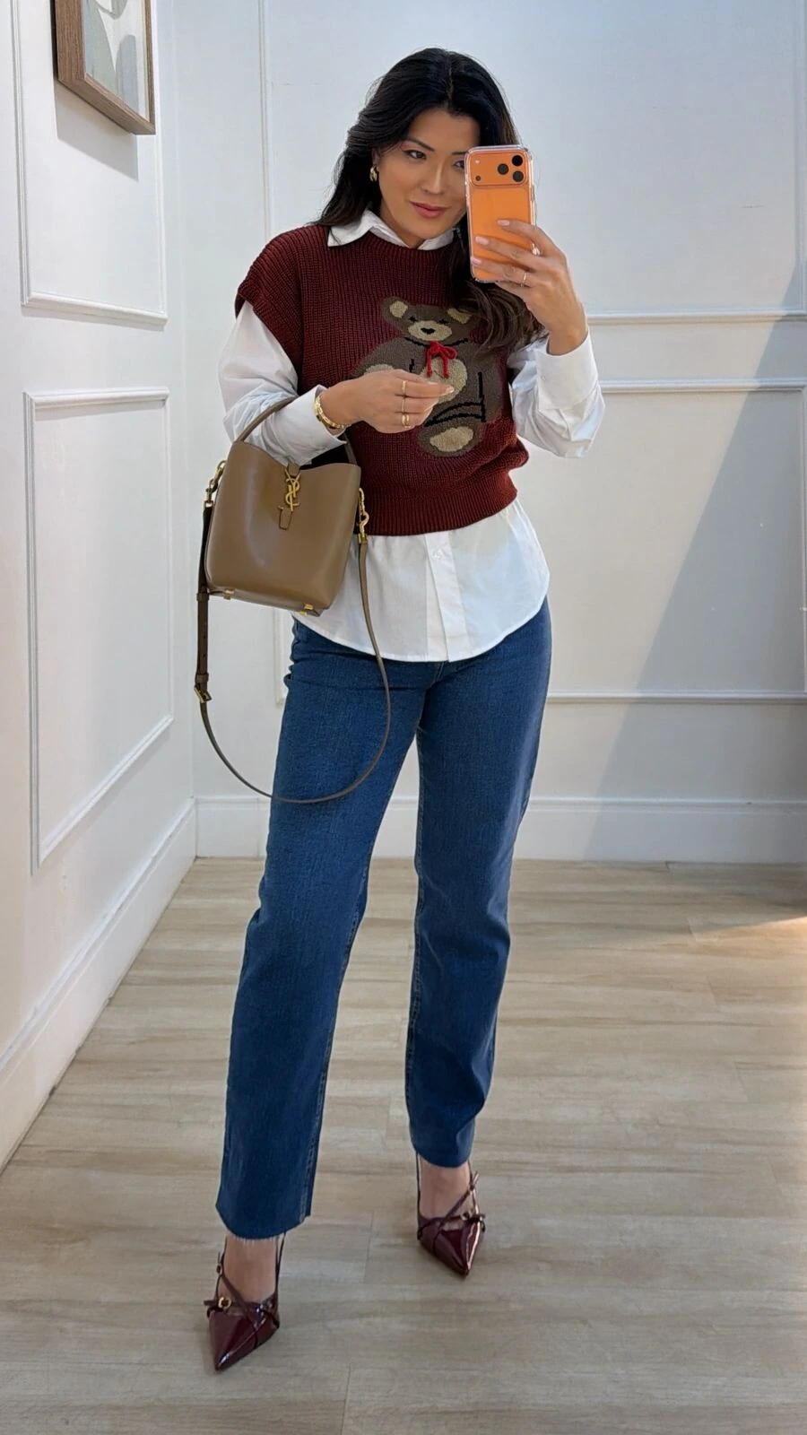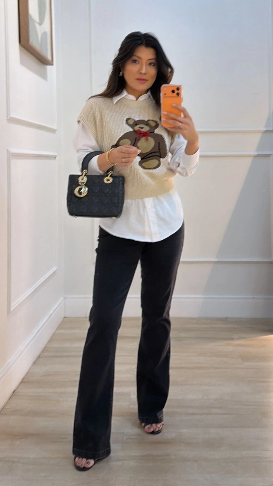 Blusa ampla confeccionada em tricot. Possui gola careca, mangas curtas, gola, punhos e barrado canelados, estampa de ursinho frontal.