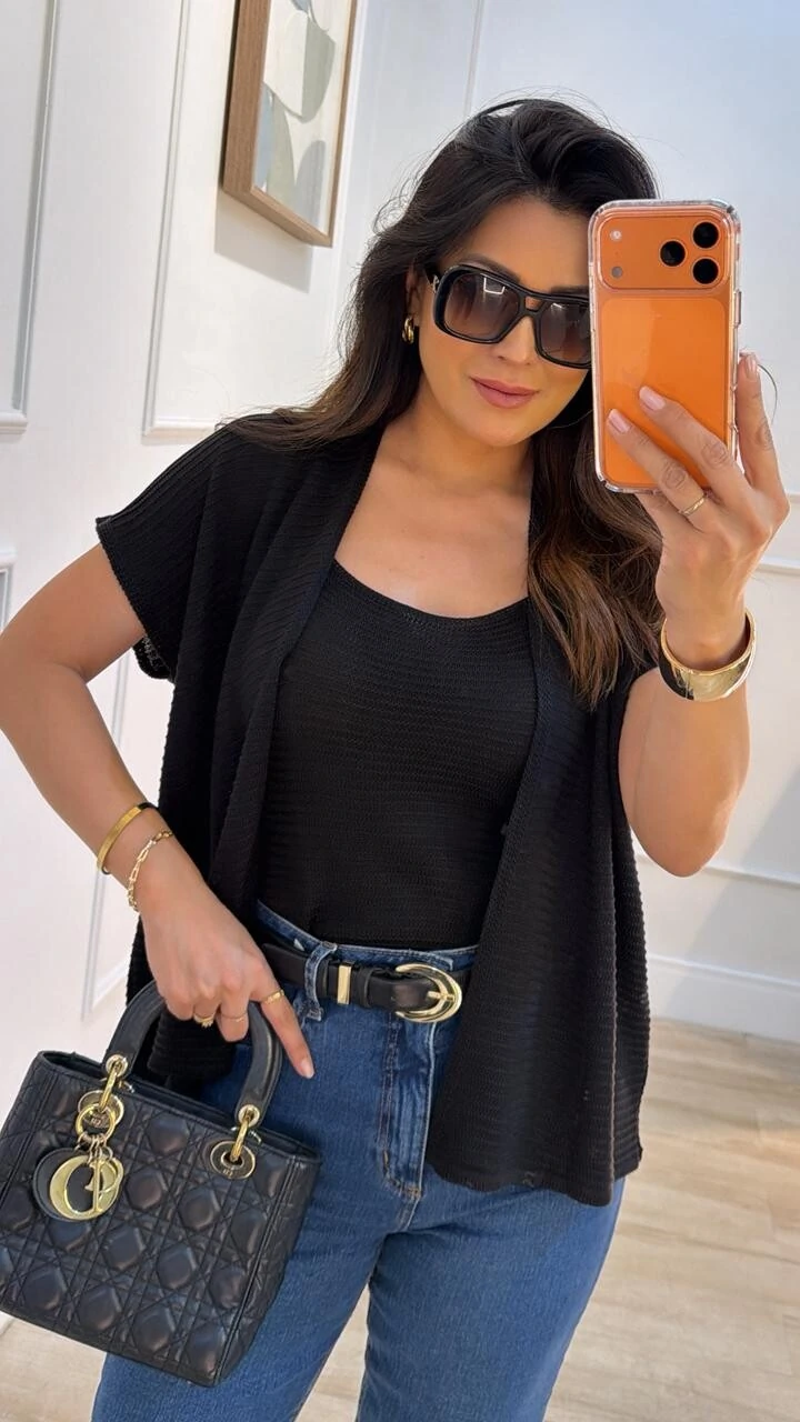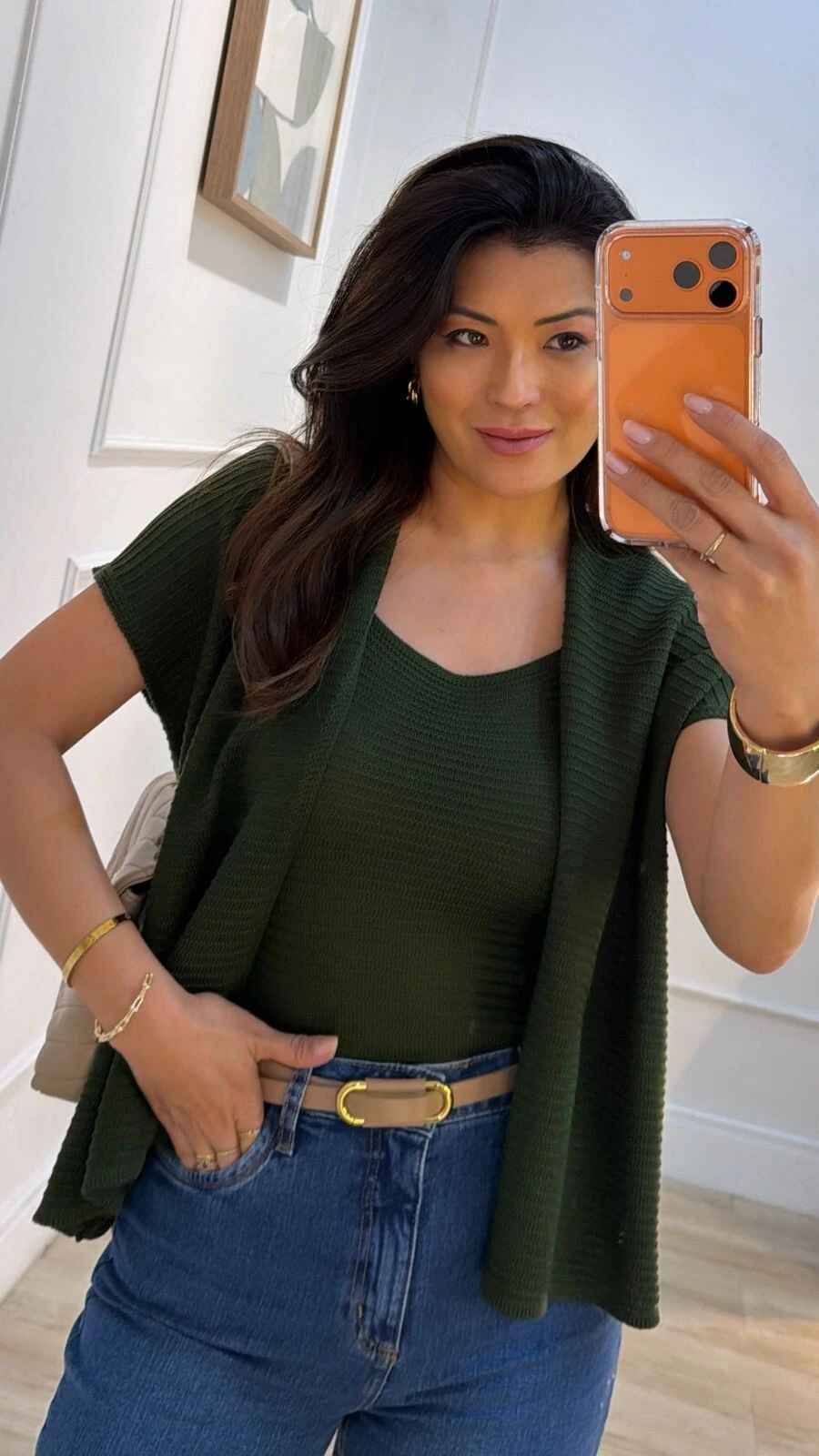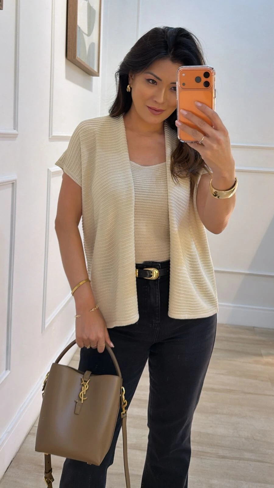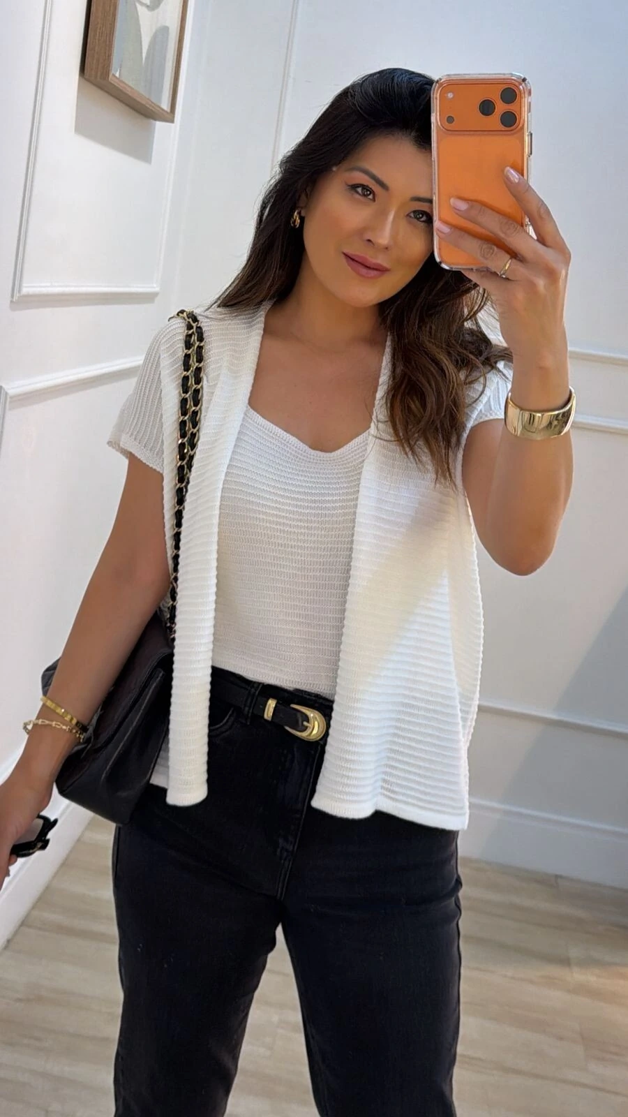 Twin set confeccionado em tricot kimono e regata. Kimono possui modelagem ampla, alças largas, textura vertical na parte posterior, punhos e gola. Regata possui alças largas, e decote reto.