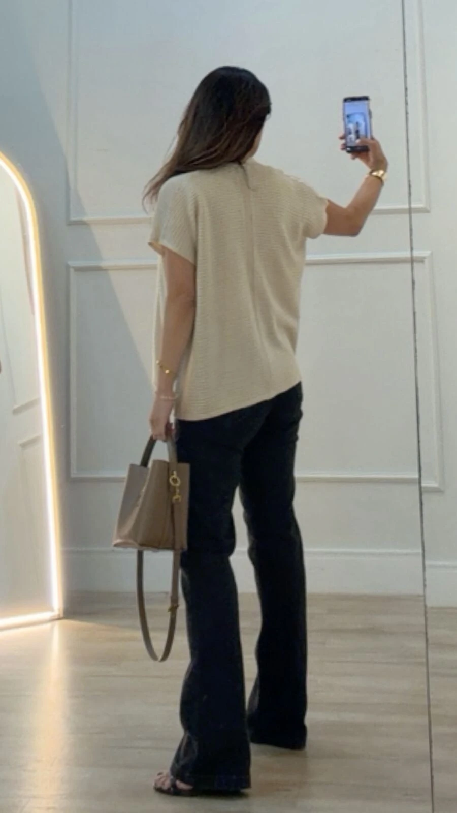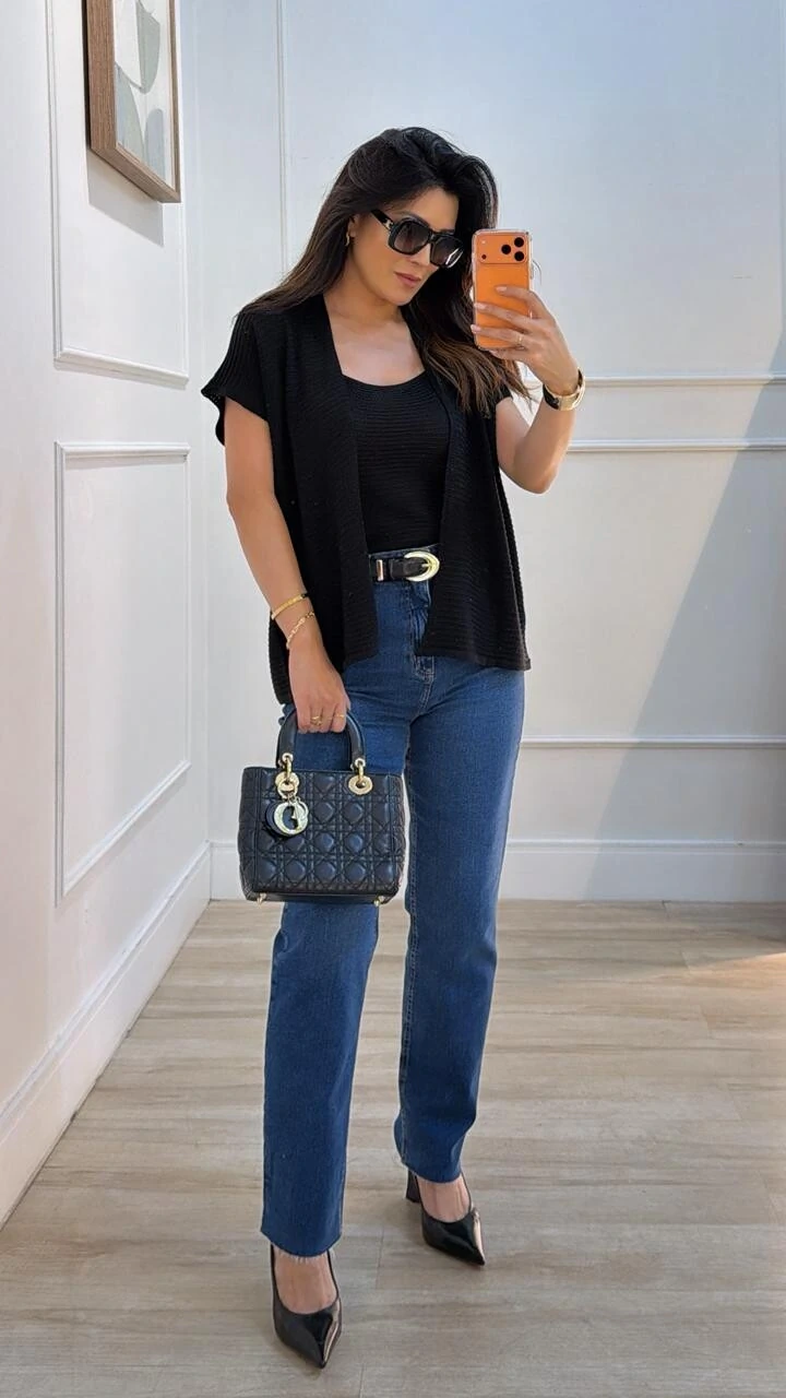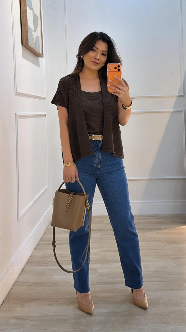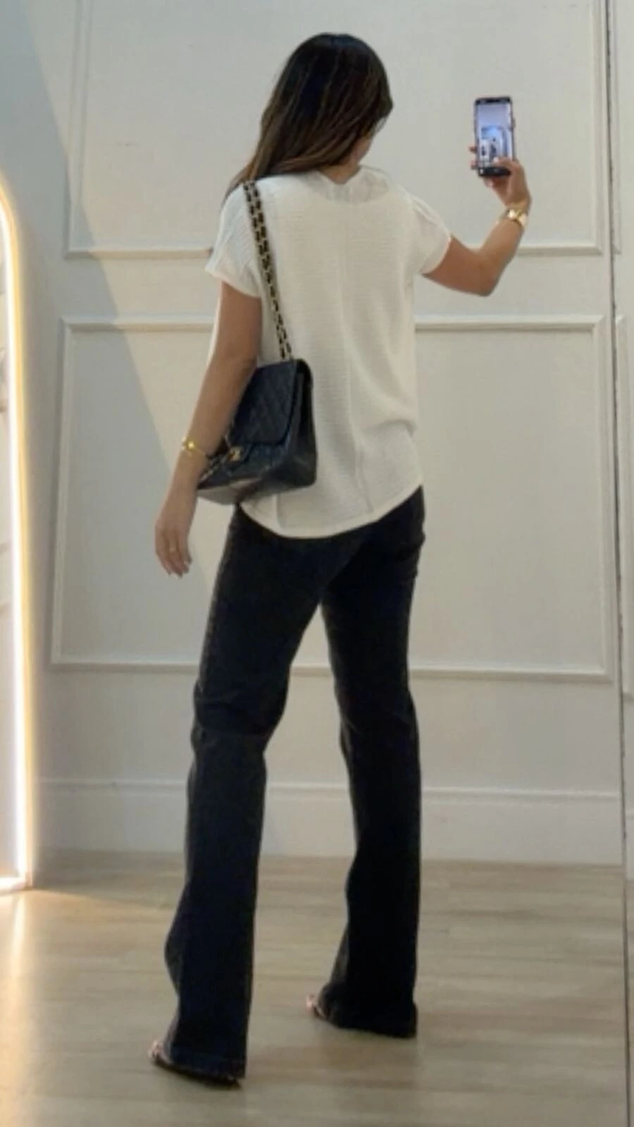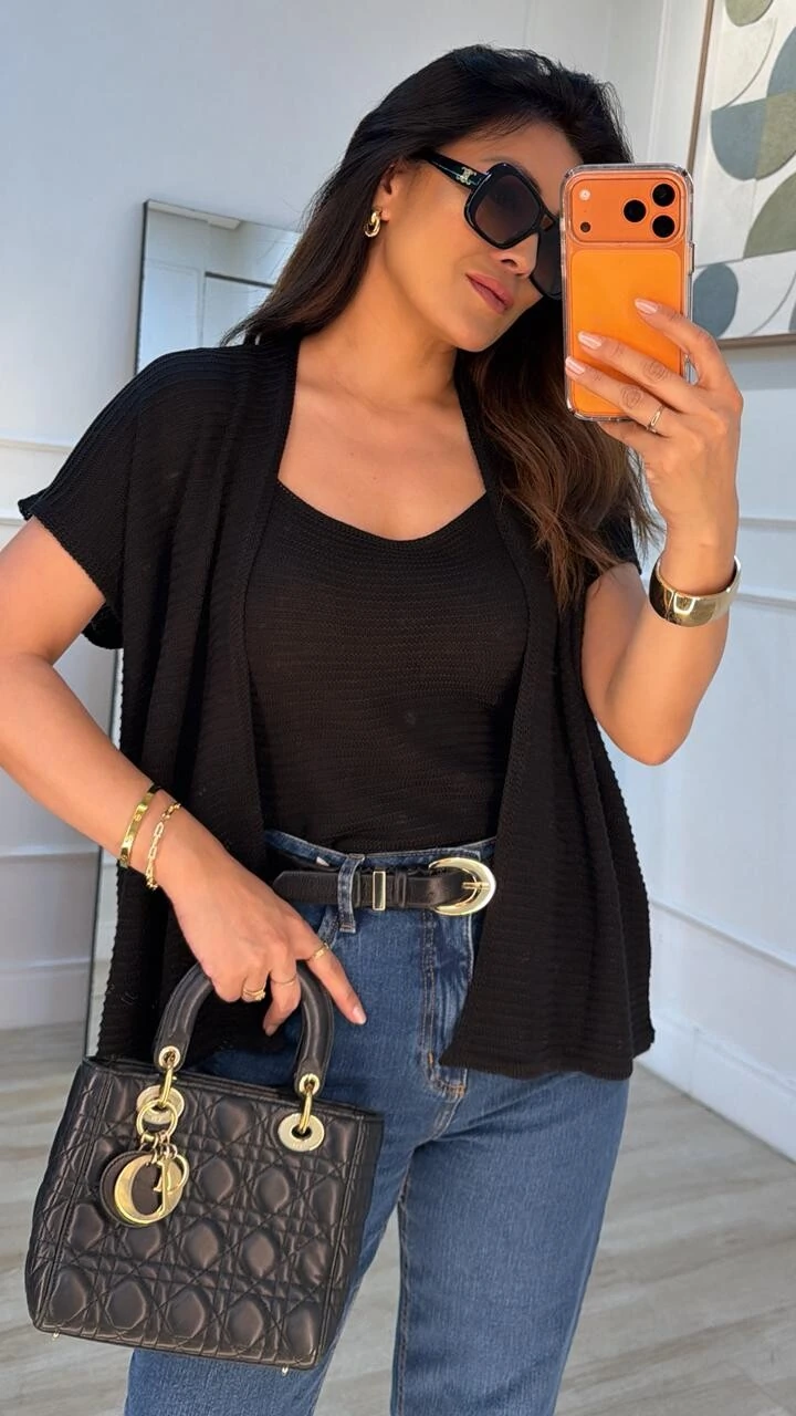 Twin set confeccionado em tricot kimono e regata. Kimono possui modelagem ampla, alças largas, textura vertical na parte posterior, punhos e gola. Regata possui alças largas, e decote reto.