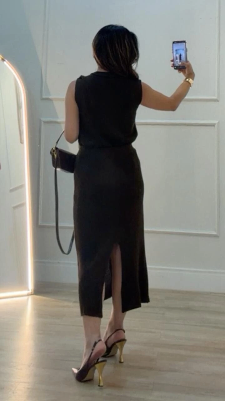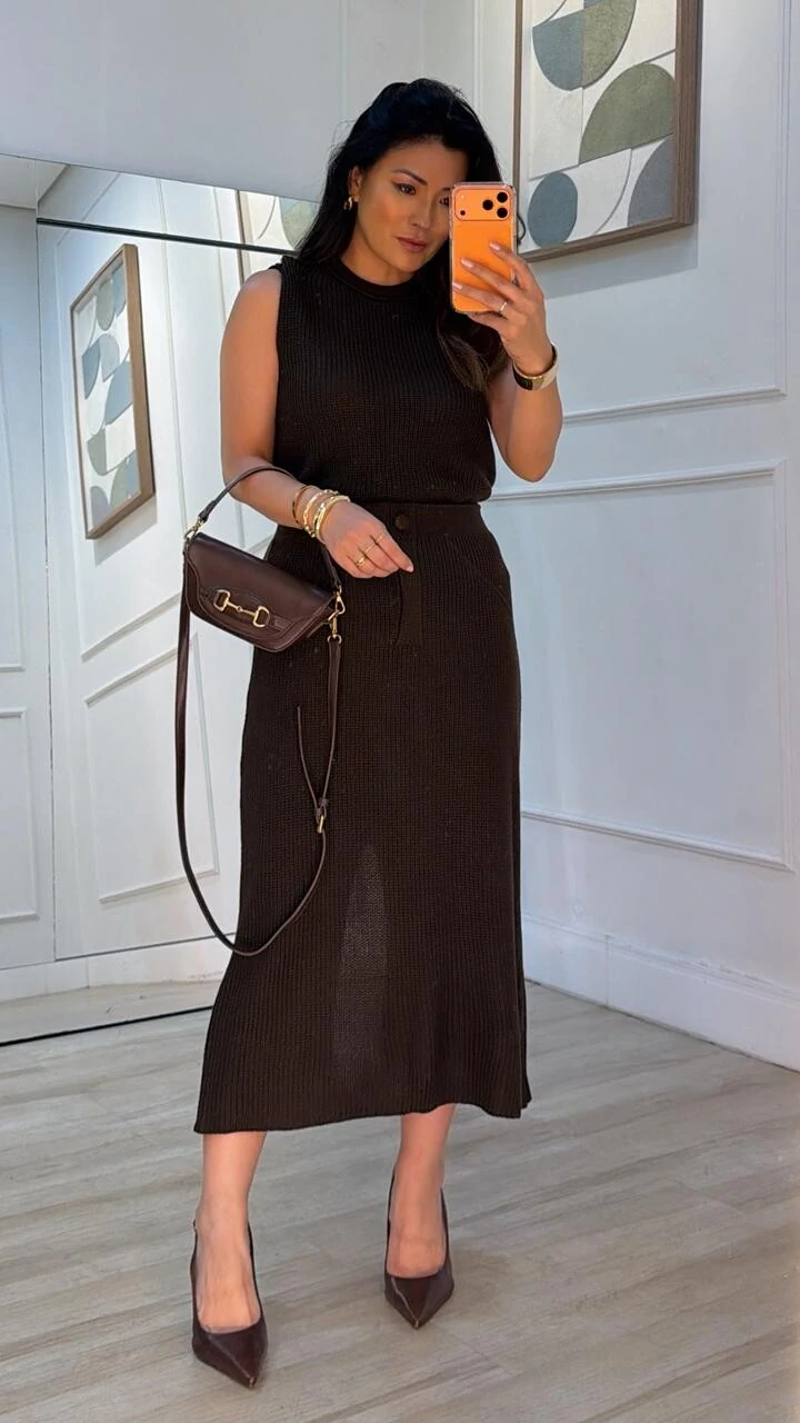 Saia midi confeccionada em tricot. Possui pala larga, detalhe de botão forrado frontal não funcional, nervura em relevo, e fenda posterior.
