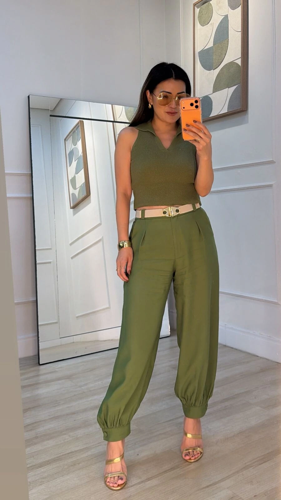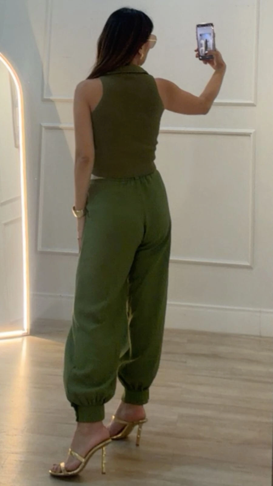 Calça cenoura confeccionada em viscose. Possui pala com elástico franzido no posterior, passantes, bolsos frontais, pregas frontais e no barrado, pesponto, detalhe de botão forrado no barrado, e fechamento pela parte frontal da peça por botão interno e zíper.