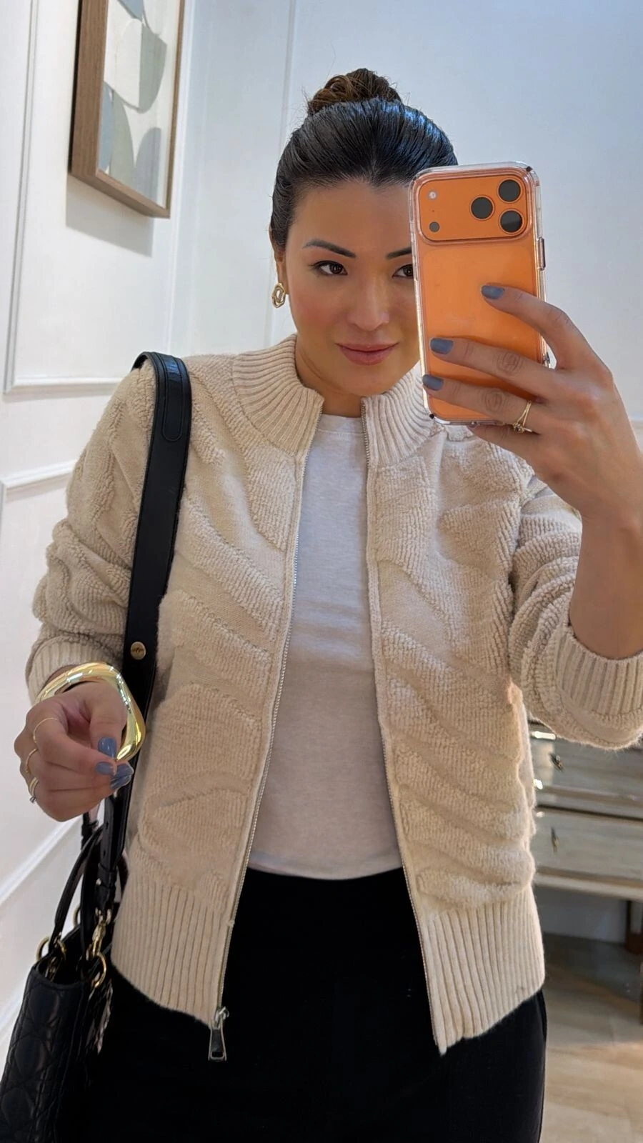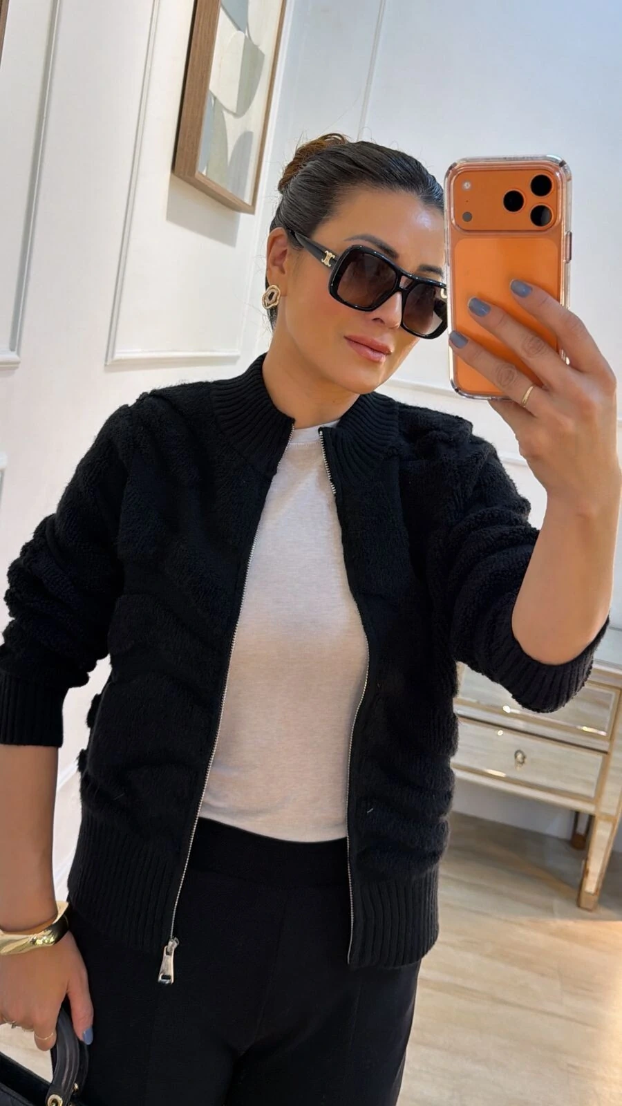 Jaqueta casaco confeccionada em tricot. Possui gola alta, mangas longas, nervuras em relevo, gola, punhos e barrado canelados, fechamento frontal da peça por zíper.