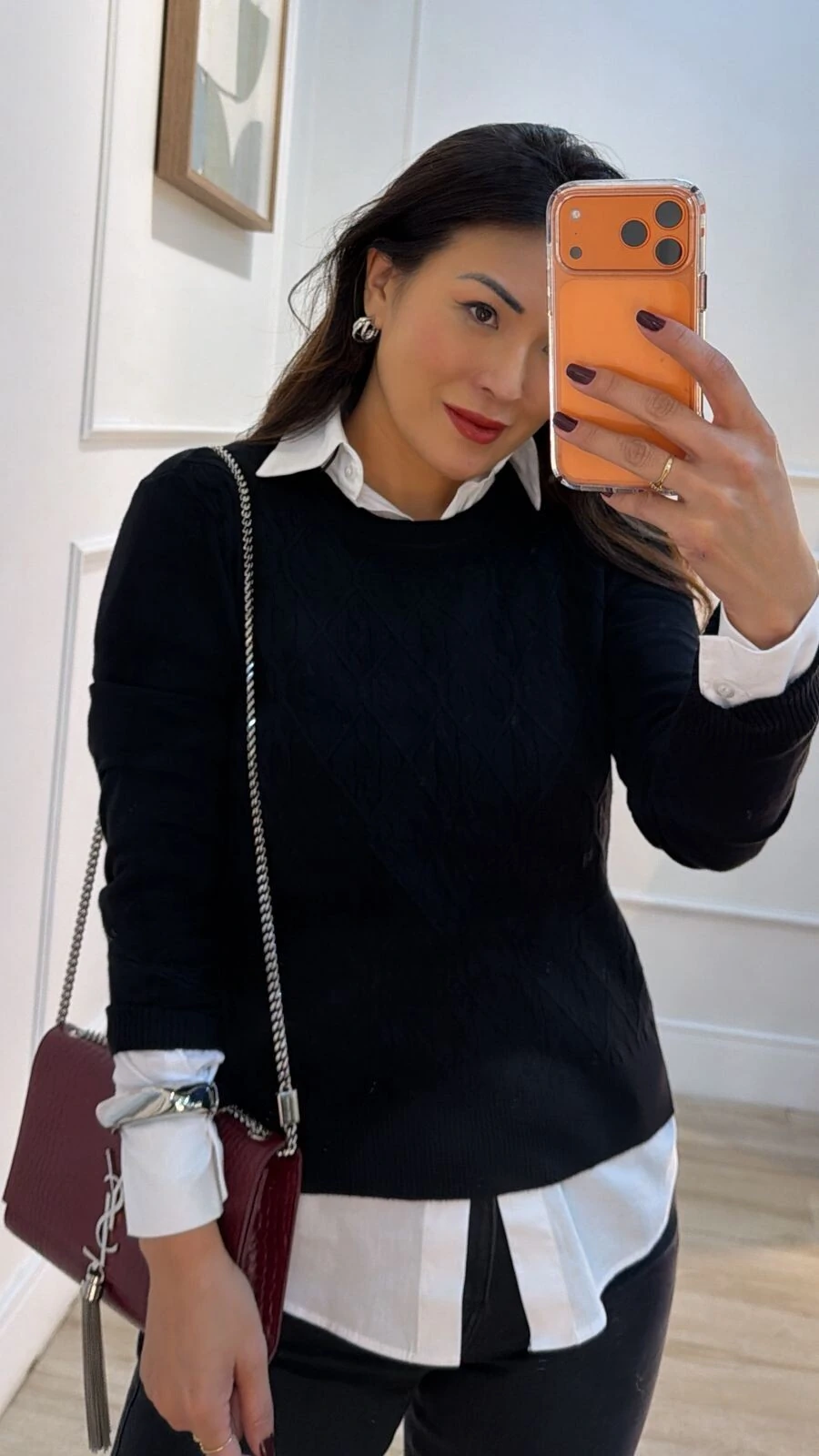Blusa confeccionada em tricot. Possui gola careca, mangas longas, detalhe de nervuras em losangos e trançados frontais, gola, punhos e barrado canelados.