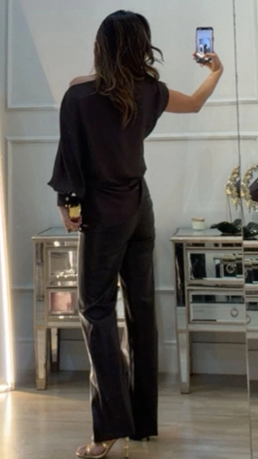 Calça reta confeccionada em couro eco. Possui pala com passantes, bolsos frontais fake, bolsos posteriores, pesponto, fechamento frontal da peça por botão forrado e zíper, cinto fino com fivela quadrada.