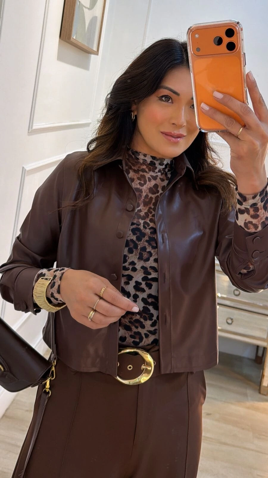 Camisa confeccionada em couro eco. Possui gola, mangas longas, punhos largos, pesponto, fechamento frontal da peça e dos punhos por botões forrados.