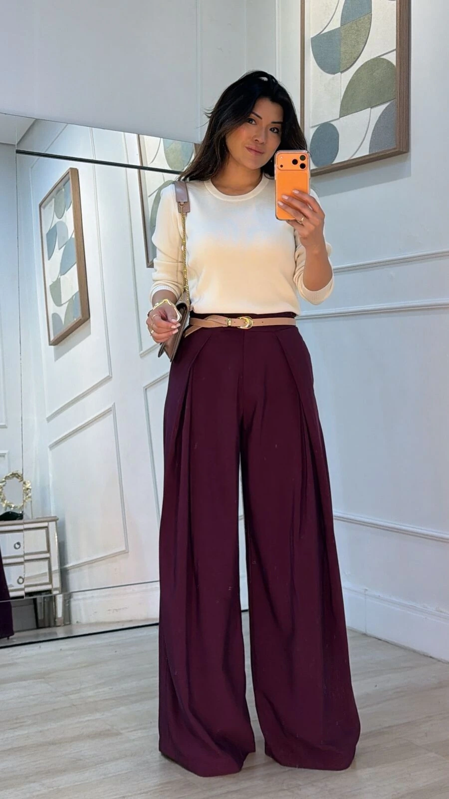 Calça confeccionada em twill. Possui pala larga com transpasse, detalhe de sobreposição, pregas frontais, pesponto, bolsos frontais, fechamento por botão interno, ganchos e zíper.