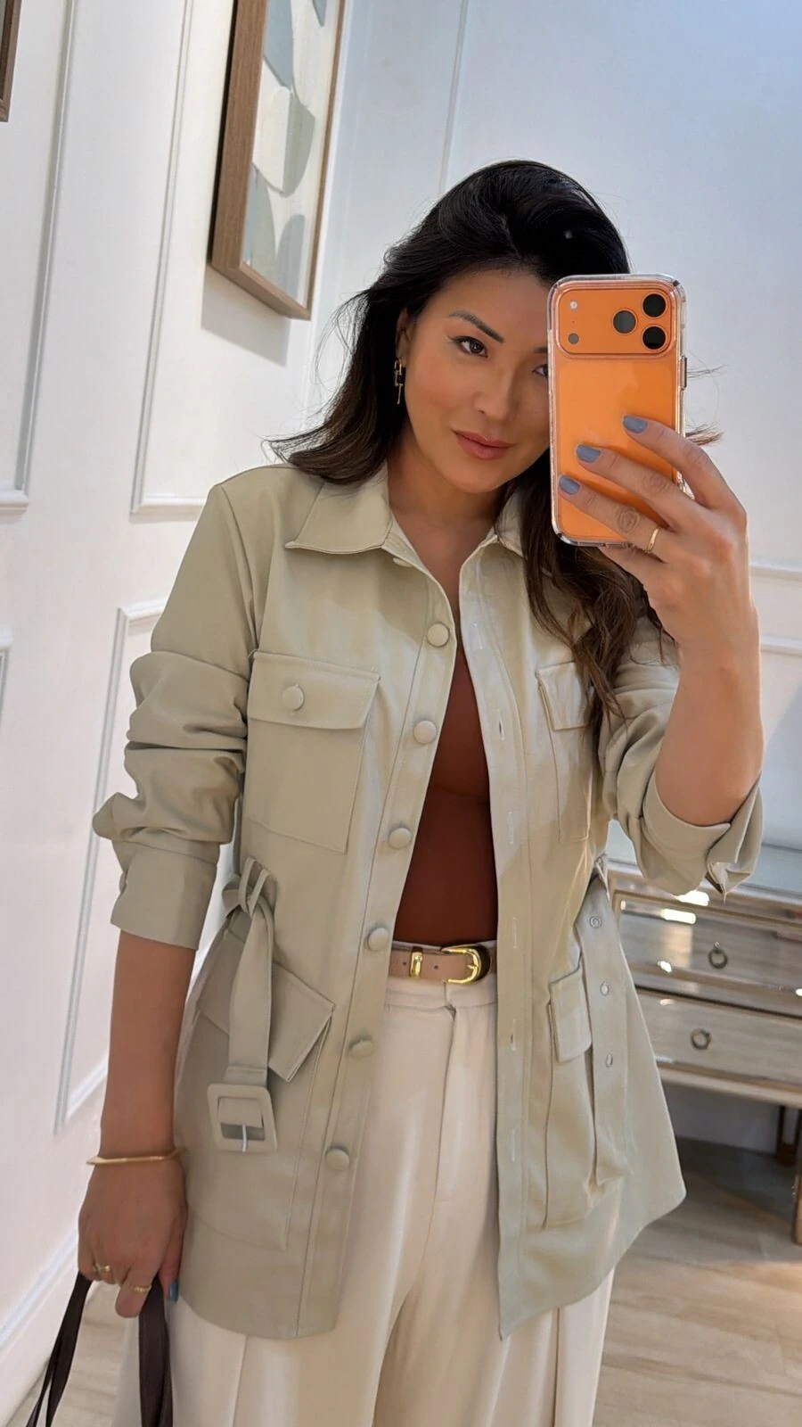 Parka casaco confeccionado em couro eco. Possui gola, mangas longas, pregas nos punhos, bolsos quadrados frontais, passantes frontais, pesponto, fechamento frontal da peça, punhos e bolsos por botões forrados, e cinto faixa.