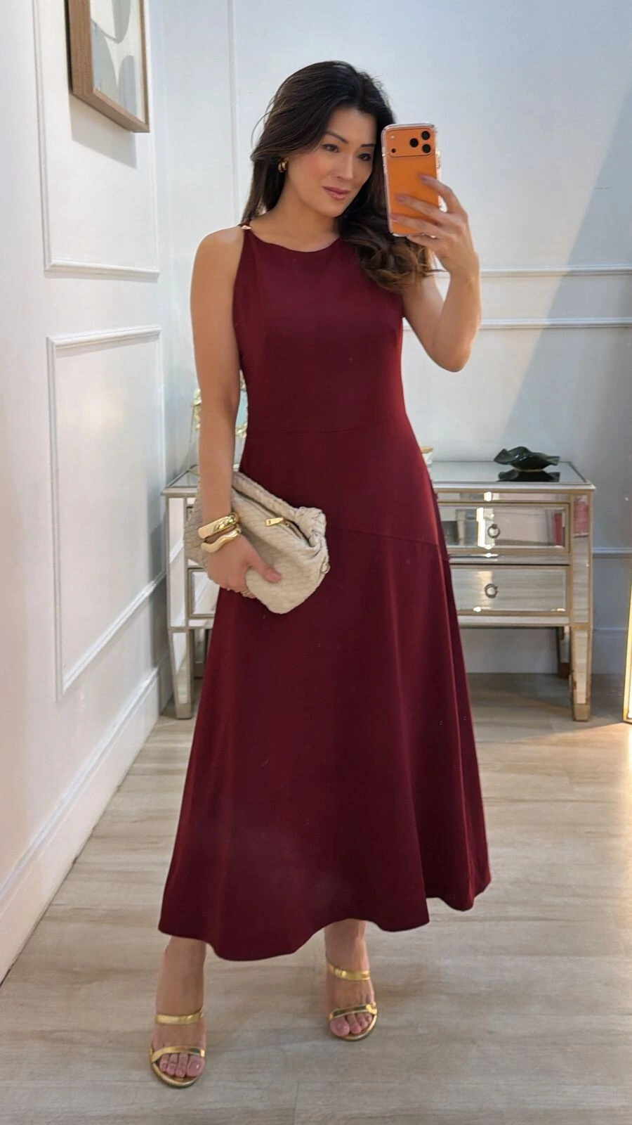 Vestido midi confeccionado em alfaiataria. Possui gola canoa, alça direita larga, alça esquerda fina com detalhe de botão funcional dourado, recorte assimétrico, pesponto, fechamento lateral da peça por zíper invisível.