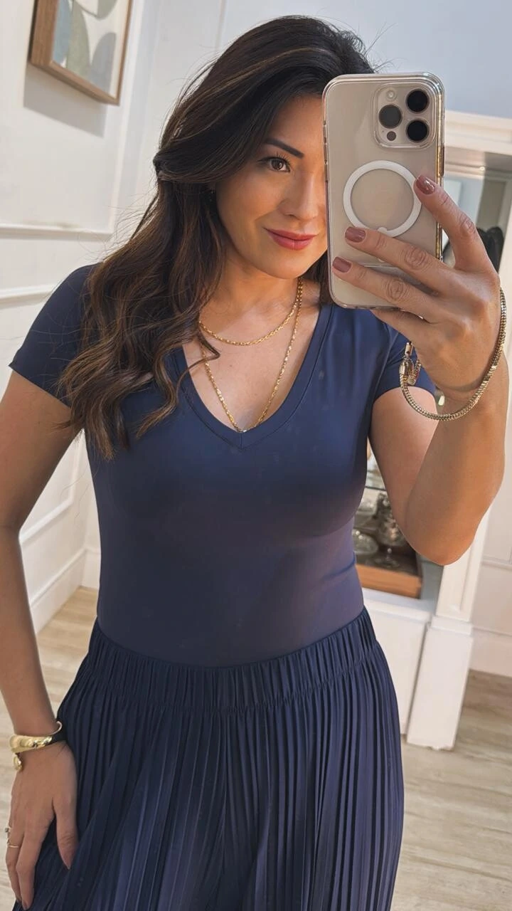 Body confeccionado em suplex. Possui decote V, mangas curtas e fechamento da peça por botões de pressão.