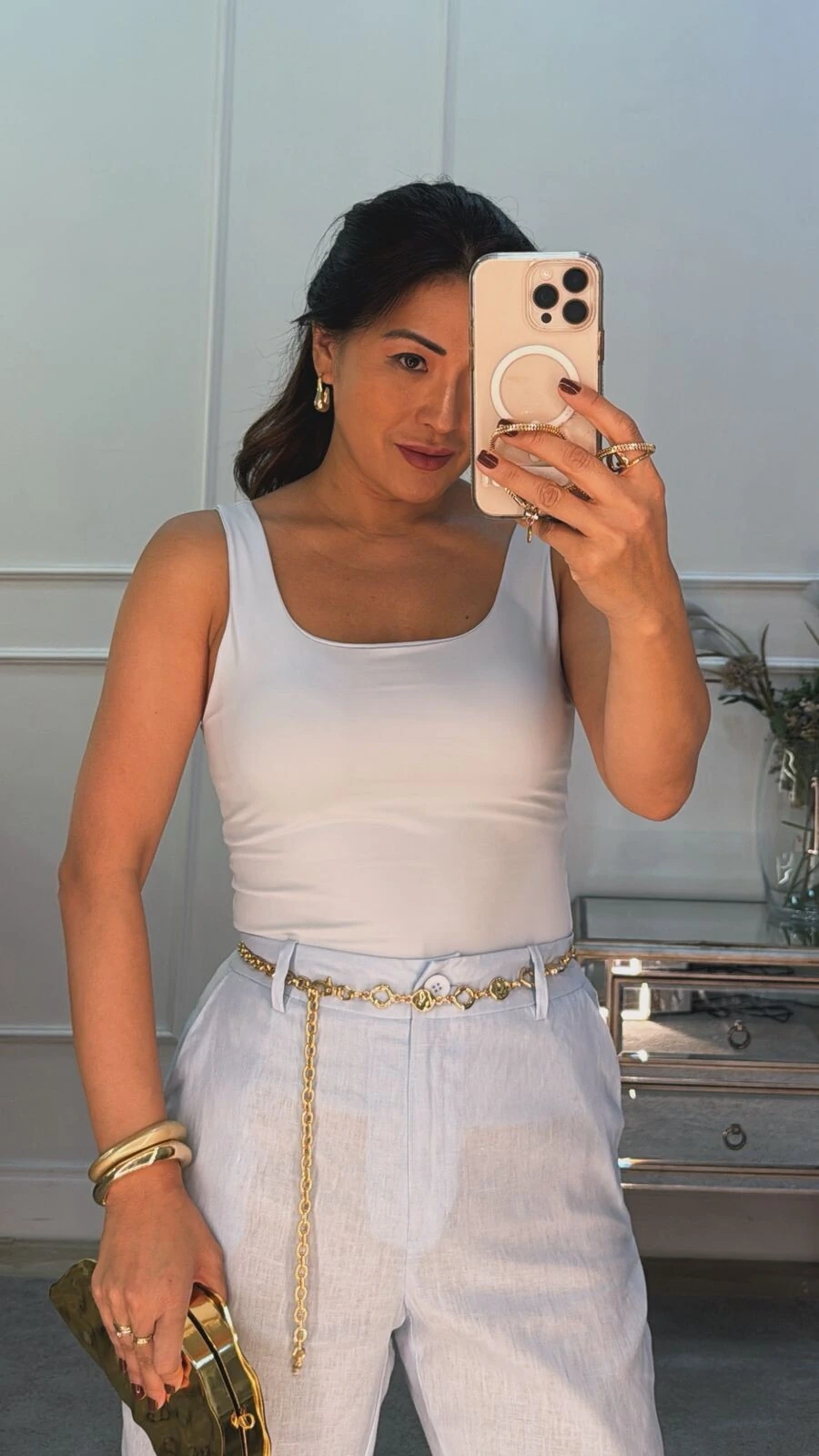 Regata suplex. Possui decote em u, alças largas, e pesponto tecido duplo nas alças e busto.