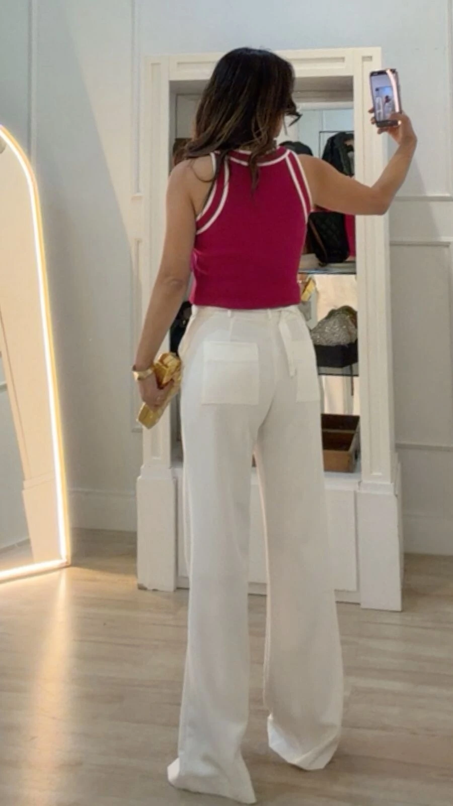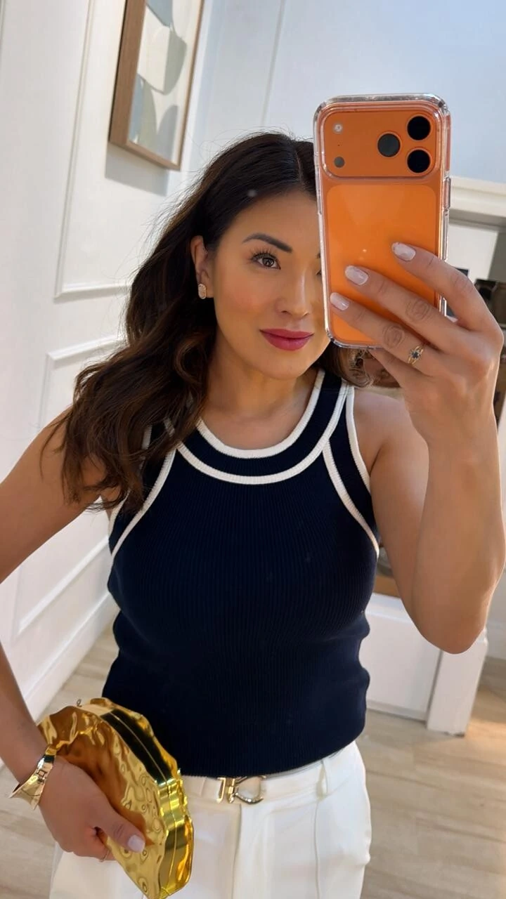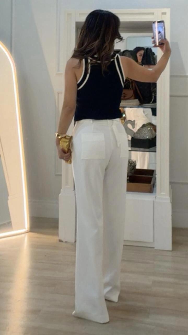 Regata bicolor confeccionada em tricot canelado. Possui decote em u, alças largas, gola e punho com detalhe de relevo.