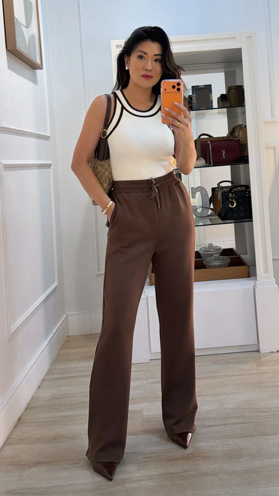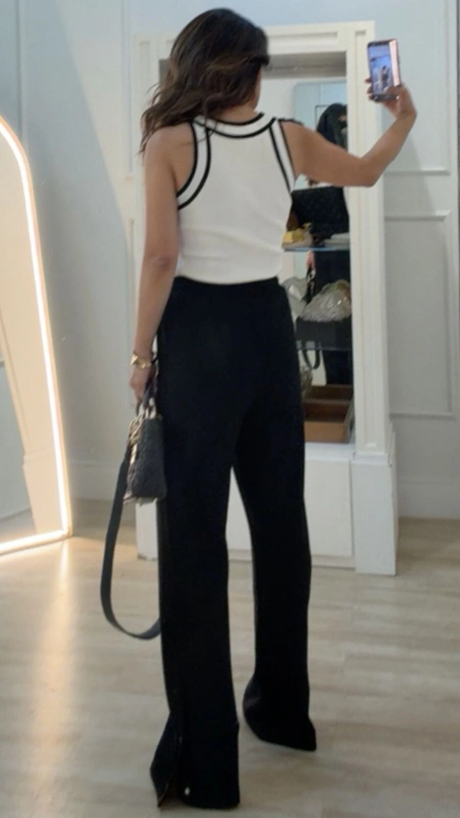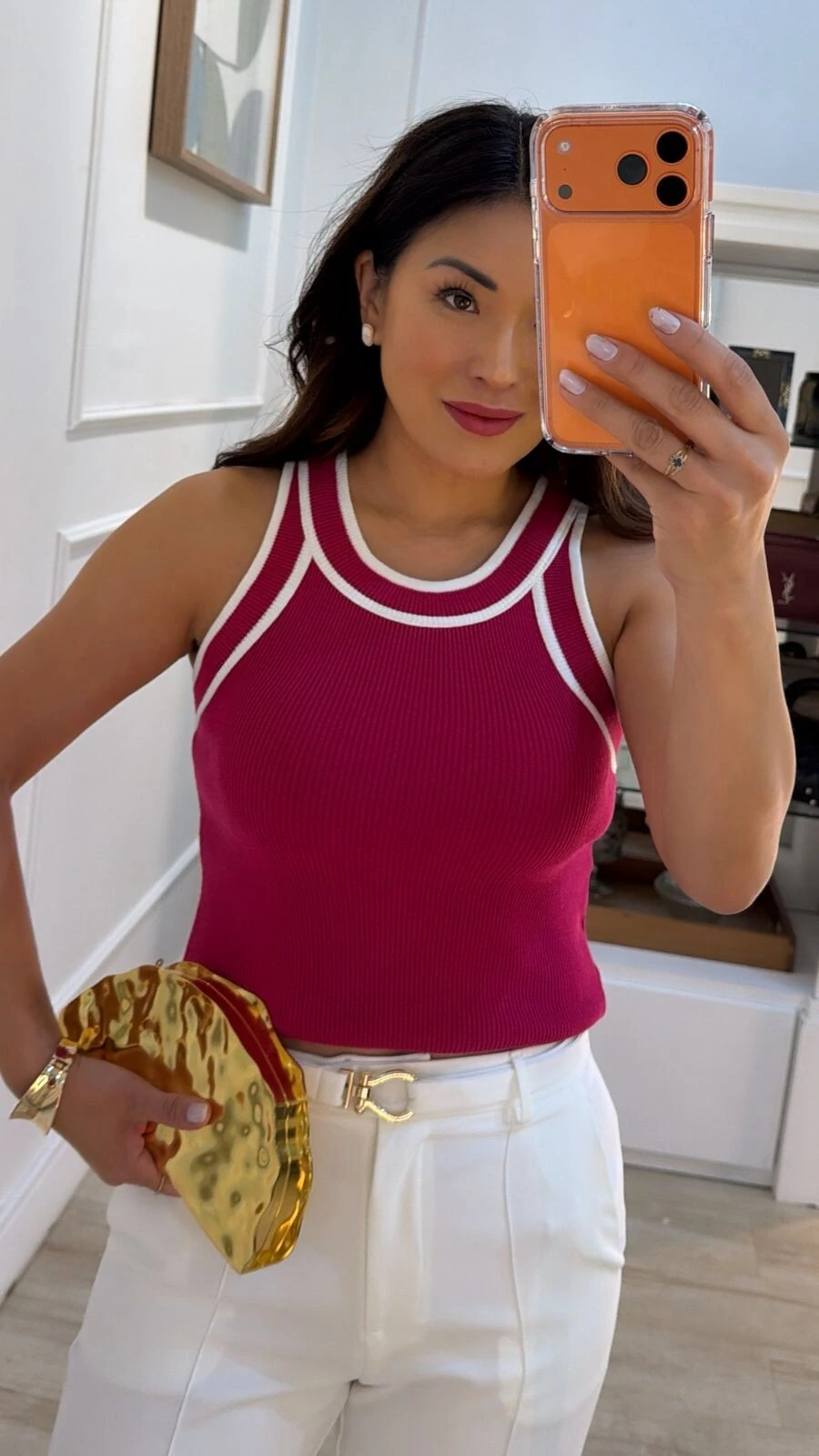 Regata bicolor confeccionada em tricot canelado. Possui decote em u, alças largas, gola e punho com detalhe de relevo.