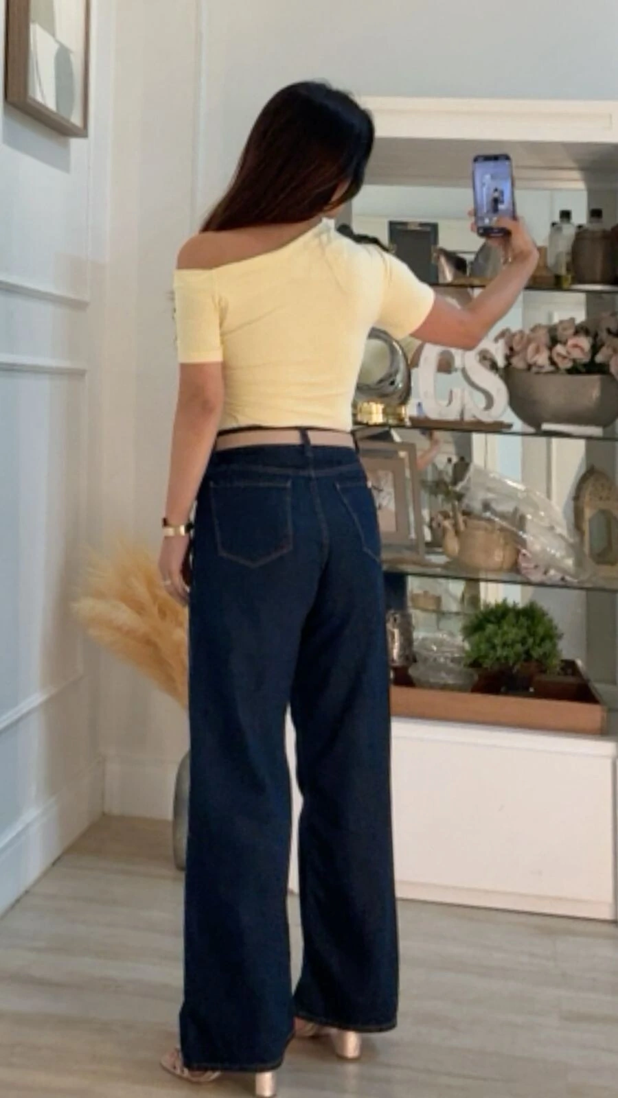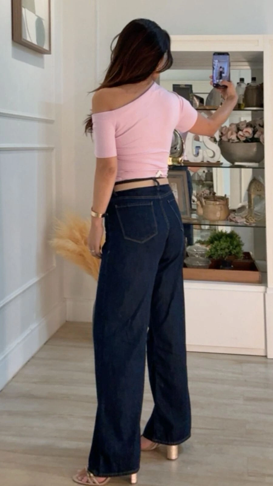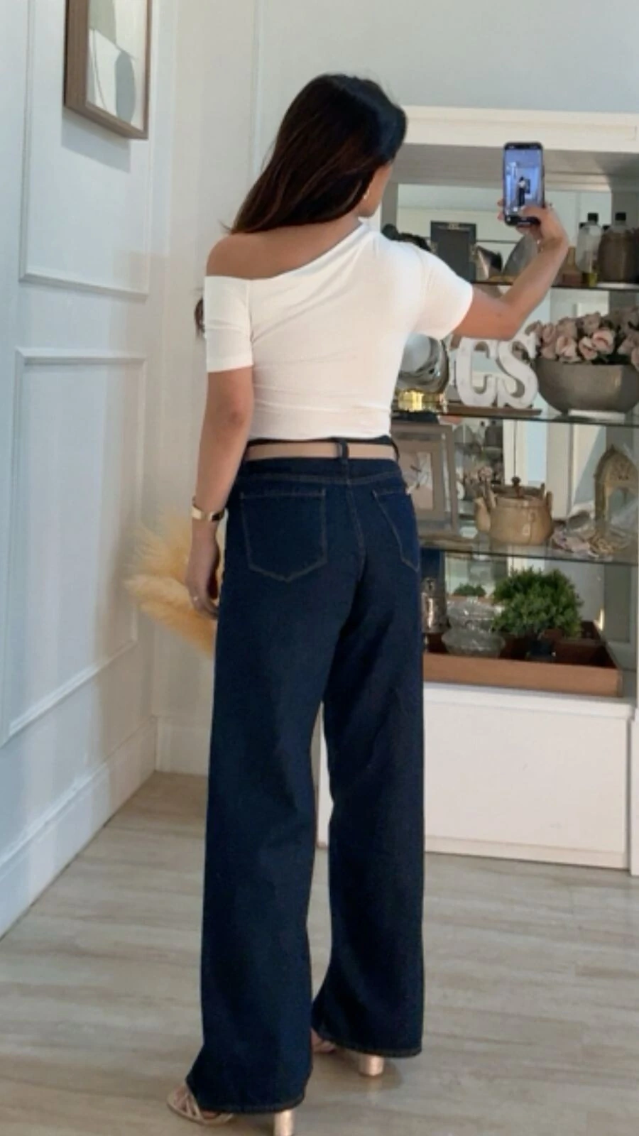 Blusa confeccionada em malha. Possui ombro vazado, mangas curtas, detalhe de pregas, e pesponto.