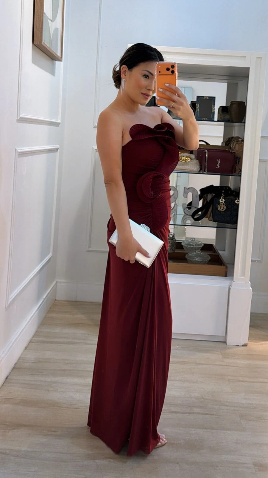 Vestido longo tomara que caia em tulê. Possui bojo, decote coração, sustentação na parte posterior da peça, detalhe de babado plissado, fechamento na parte posterior da peça por zíper, fenda lateral e forro.